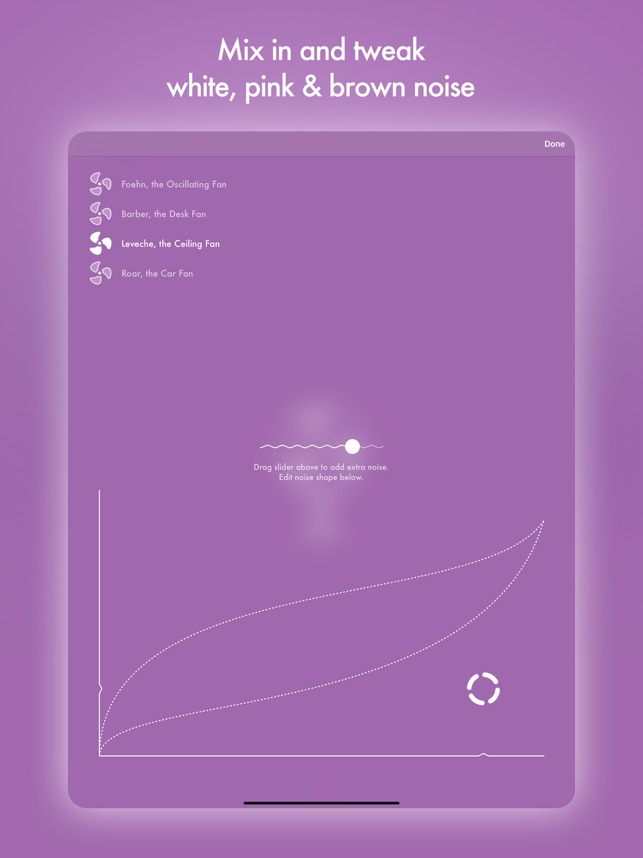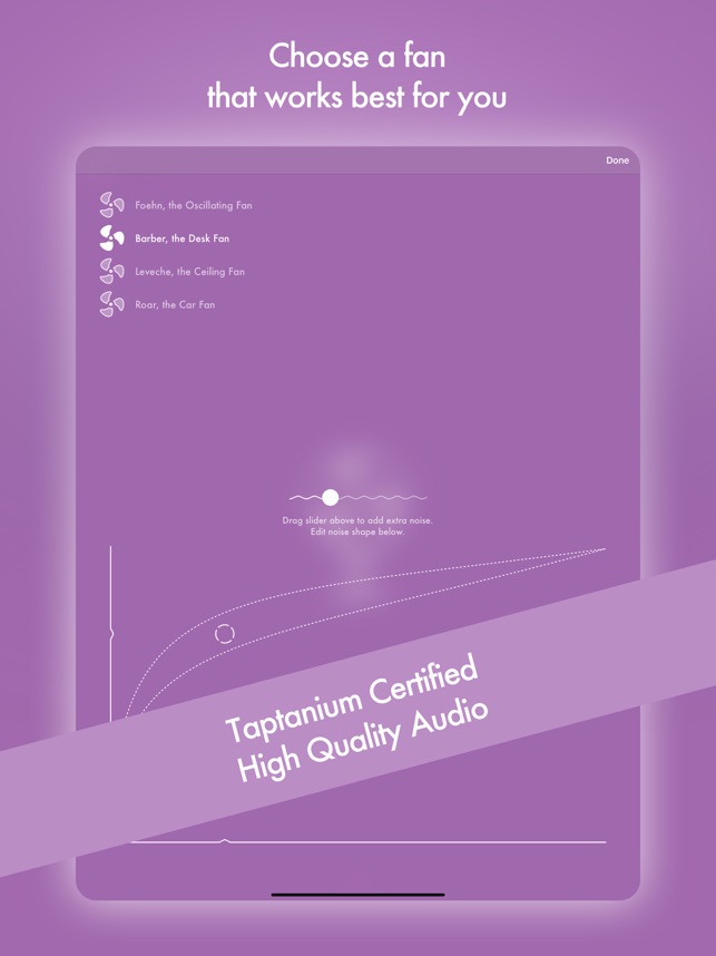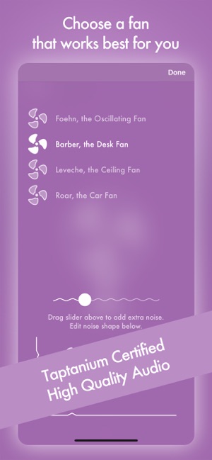 Can't sleep? Need a fan? Get Sleep Better Fan, a powerful, customizable fan that masks unwanted noise so you can get some restful sleep.Join millions of people around the world who fall asleep to fan noise. Recreate the sound of a real fan with Sleep Better Fan and use the powerful noise shape mixer to blend in additional white, pink or brown noise to your liking.Sleep Better Fan helps you mask unwanted noise such as city traffic, loud neighbours or hotel guests, snoring and much more.Get Sleep Better Fan now, sleep great tonight!Sleep Better Fan consumes less energy than a real fan and thus saves you money on electricity. Take it with you wherever you go, even on the plane or in the hotel.≈ Features ≈ + Four different high quality fans: Oscillating, ceiling, desk and car ventilation.+ Real fans recorded with high-end professional equipment.+ Mix in and tweak white, pink and brown noise.+ Taptanium Certified Quality Audio.+ Sleep timer with soft fade out. Energy-efficient.+ Univers