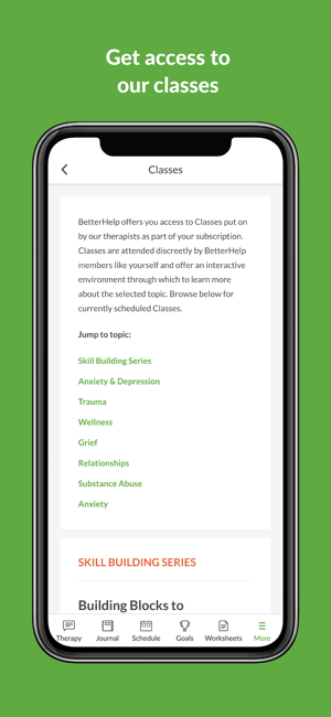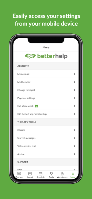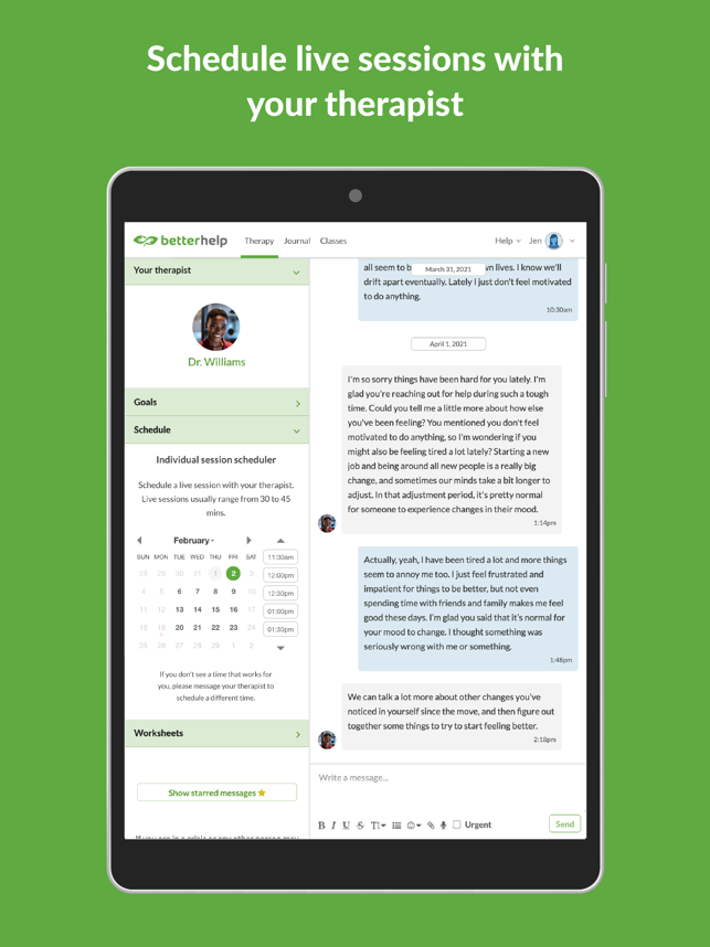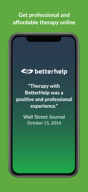 BetterHelp is the convenient way to get professional help from a licensed therapist. With over 30,000 trained, experienced, and accredited therapists covering a wide range of areas – from depression and anxiety to family and couples therapy – it’s never been easier to receive personal, professional help when you need it.-------------------------------------------BETTERHELP – FEATURES-------------------------------------------• Over 30,000 licensed, accredited, and highly experienced therapists• Match with the right therapist for you based on your needs, preferences and location• Send your therapist a message as often as you want• Schedule live sessions with your therapist or use the secured messenger• Gain access to constructive, educational group webinarsPROFESSIONAL HELP, PERSONALIZED FOR YOUFacing obstacles alone can be daunting – receiving support and guidance from a professional therapist has been shown to make huge, positive changes to help you overcome personal challenges. When