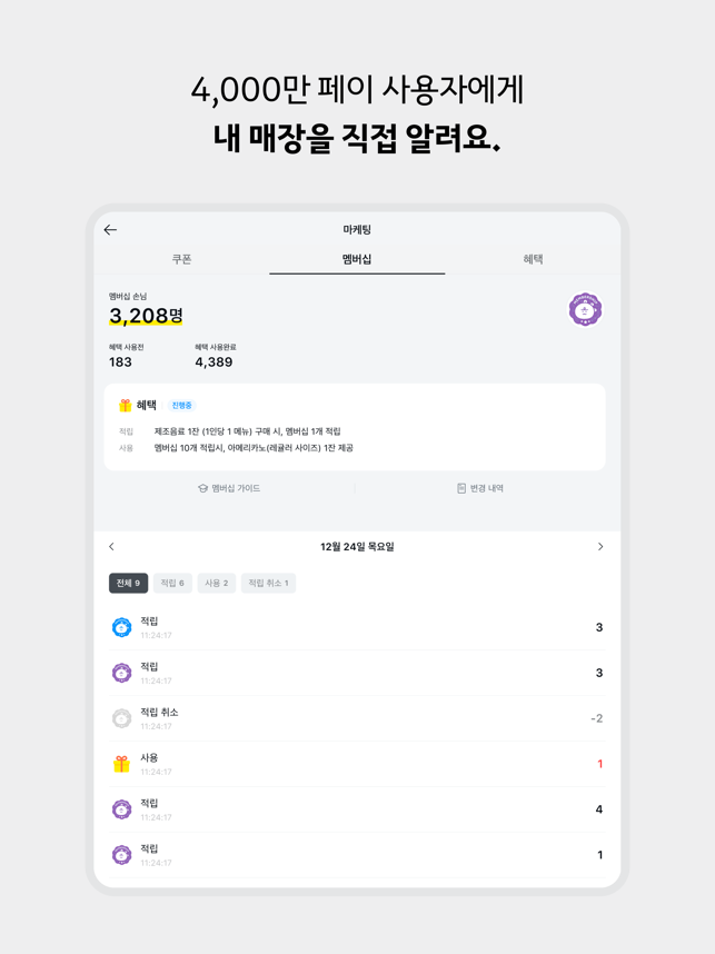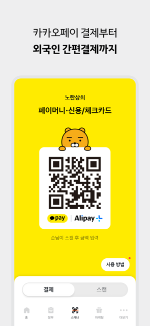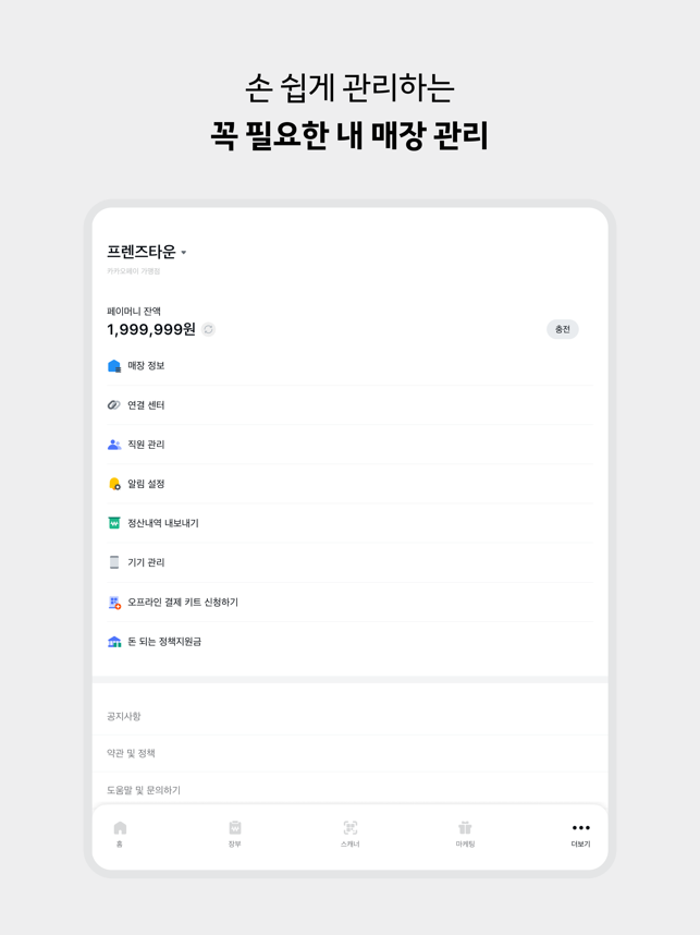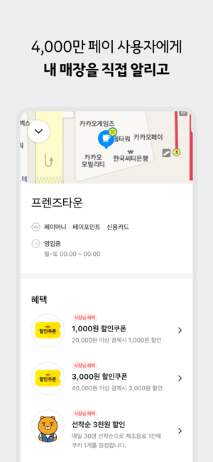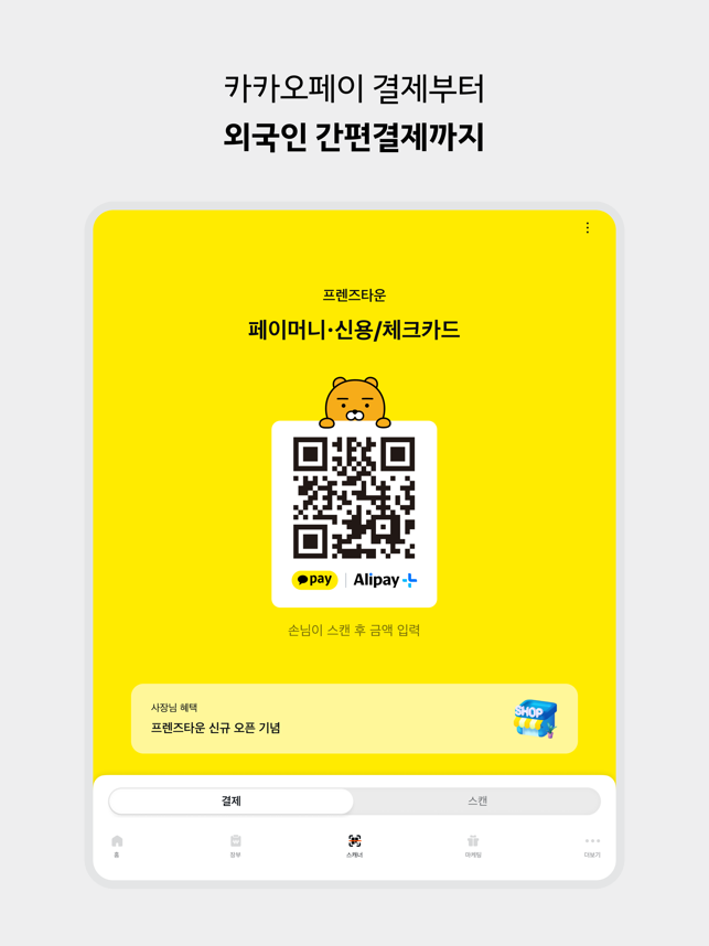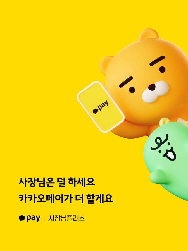사장님도 카카오페이● 내 매장의 모든 매출/입금을 하나의 앱으로 관리● 앱으로 이용하는 카카오페이 결제, 외국인 결제(알리페이+)● 카카오페이 서비스에 노출되는 내 매장 마케팅 정보▶ 카카오페이 사장님플러스 주요 기능- 카카오페이, 카드, 현금, 배달앱까지! 어제 매출, 오늘 입금예정, 미입금액을 매일 앱으로 볼 수 있어요.- 함께 하는 직원들도 본인의 스마트폰으로 매출내역을 확인하고 결제 취소까지 할 수 있어요.- 별도의 추가 비용 없이 APP으로 카카오페이와 외국인 결제(알리페이+)를 이용할 수 있어요.- 내 매장 멤버십도 대형 브랜드 매장처럼 쌓고 단골 고객을 만들어 보세요.- 추가 기기 설정 후 매장에 비치하면 손님이 직접 QR코드로 결제하고 멤버십 바코드를 찍을 수 있어요.- 내 매장 쿠폰, 혜택을 등록하면 카카오페이에서 검색되고, 내주변에 홍보도 돼요. 정보통신망법 제22조의2(접근권한에 대한 동의)에 따라 아래와 같이 앱 사용 시 필요한 접근권한을 안내합니다.○ 선택권한- 카메라 : 카카오페이 멤버십, 청구서, 기기 인증 코드 스캔 용도- 알림 : 서비스 이용 시 알림 수신*선택 권한은 허용하지 않아도 해당 기능 외 서비스 사용이 가능합니다.○ 카카오페이 가맹점 센터 챗봇 : 24시간, 365일 상시 (홈 우측 상단 > 상담 아이콘)