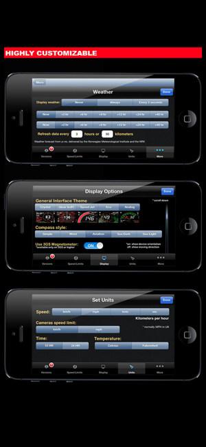 aSmart HUD + is simple and clear vehicle digital dashboard featured by- HUD mode- SHORT TIME WEATHER FORECAST- IPOD PLAYLIST REMOTE CONTROL- ADJUSTABLE TRANSPARENCY APPLE MAPS SCREEN- EDITABLE FIXED SPEED CAMERAS DATABASE- EDITABLE RED LIGHT CAMERAS DATABASE for USA, Australia and Canada- PHOTO CAMERA WITH IMAGE MARKING SUPPORT It visualizes your- current speed- average speed,- time,- heading,- altitude,- trip elapsed time,- distance/time/direction to stored Home location,- weather forecast for nearest 48 hours the with 3-hour time interval,- maximum reached speed (during the current trip or all your trips), maximum altitude and maximum distance to the starting point of your trip. Also it shows- color coded distance to the nearest known fixed speed camera;- it's speed limit (if known);- it's position, relatively to your moving direction, what gives you an idea is the camera in front or behind you; The fixed cameras database includes an information about speed cameras in- Europe