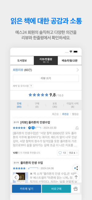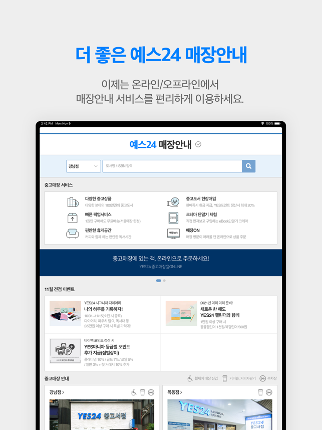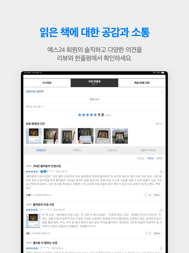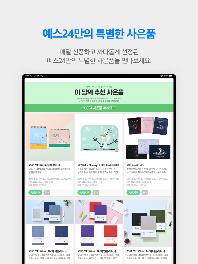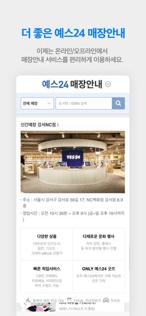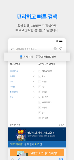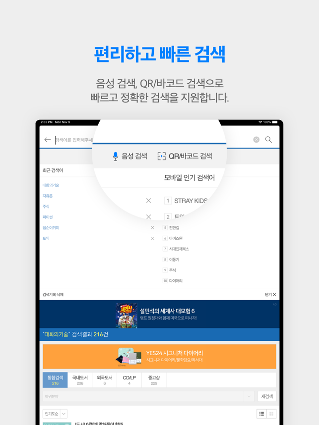 스마트폰에 쏙 들어온 내 손 안의 서점, 예스24 도서앱! 예스24의 다양한 기능을 쉽고 빠르게 앱에서 사용해보세요:)[도서앱 주요 기능] ● 앱푸시 알림 선착순 이벤트 진행 시 푸시 알림으로 바로 참여! 수신동의자에게만 알려주는 깜짝 이벤트로 득템! 이달의 혜택을 누구보다 빠르게 푸시로 받아보세요!● 이벤트 혜택 주말엔 보너스, 이달의 책, 마니아 상품권 혜택 등, 매월 YES24 드리는 풍성한 혜택으로 즐거운 쇼핑을 누려보세요! 신규 앱 다운로더에게는 추가 상품권을 드려요! ● 즐겨찾기 서비스 나에게 딱 맞춘 메뉴만 모아서 볼 수 있는 즐겨찾기 서비스! 더 자주 보고 싶은 분야는 별표 모양을 클릭하여 즐겨찾기에 저장할 수 있어요! ● 총알배송당일배송, 아침배송, 하루배송, 지정일 배송까지! 예스24가 제공하는 다양한 배송 서비스로 더욱 빠르고 편리한 독서 생활을 즐겨보아요! ● 선물하기 예스24 선물하기로 소중한 분께 마음을 전하세요! 예사회원끼리 직접 책 선물을 추천! 시즌별 어울리는 책 추천 서비스를 활용해보세요! ● 음성인식 모바일 음성인식으로 상품 검색 및 메뉴 이동을 보다 더 쉽게 이용할 수 있어요! 1:1 문의 및 한줄평 등의 서비스를 음성으로 이용 가능해요! ● 바이백 버리기는 아까운 중고책, YES24에 판매할 수 있어요! 스마트폰 바코드 촬영으로 더욱 쉽고 빠르게 바이백 신청! YES포인트로 정산 시 회원 등급별 최대 10% 추가 지급! [앱 접근 권한 안내]정보통신망법 제 22조의2(접근권한에 대한 동의)에 준수하여 앱 서비스 이용 시 필요한 접근권한을 아래와 같이 안내드립니다.● 필수 접근 권한- 필수 권한 없음● 선택 접근 권한① 알림 : 기기 식별 및 푸시 알림 수신, 보이는 ARS 이용을 위해 필요합니다.② 카메라/사진 : 바코드 검색, 리뷰 작성 및 1:1 문의 시 파일 첨부를 위해 필요합니다.③ 위치 : CU편의점 픽업 서비스 이용을 위해 필요합니다.※ 선택 접근 권한은 해당기능 이용 시 개별로 동의를 받고 있으며, 동의하지 않