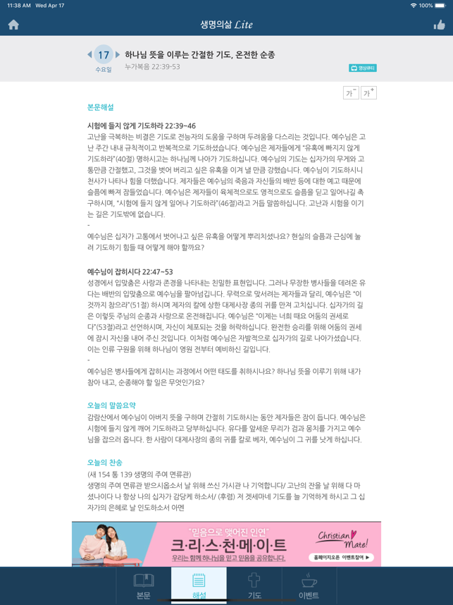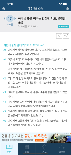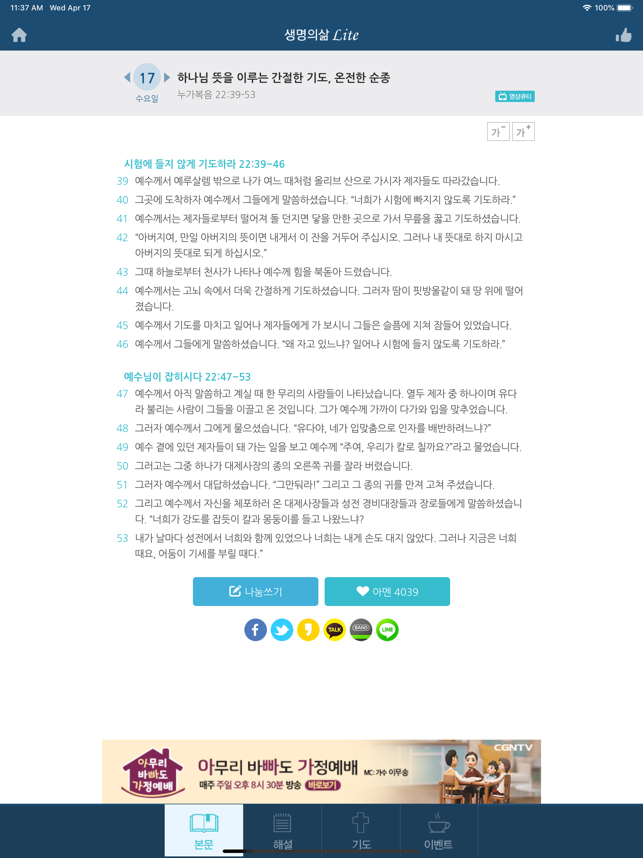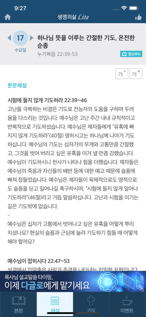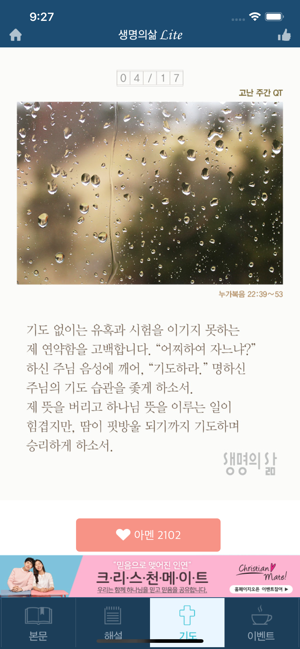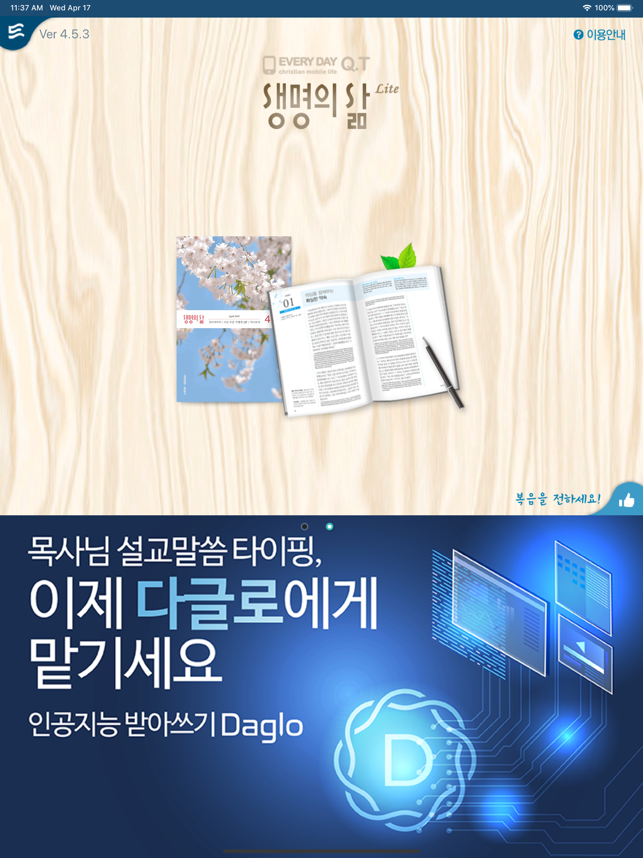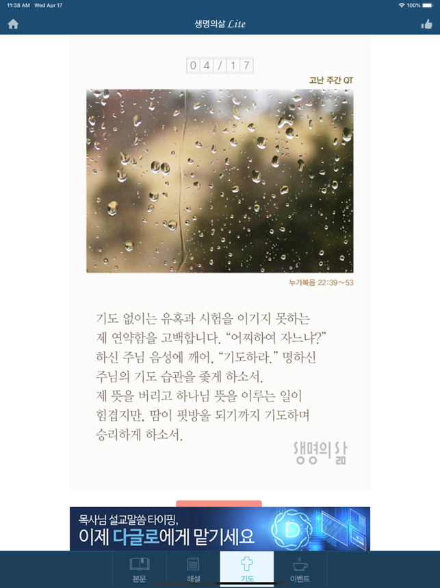 언제 어디서나 모바일 QT생명의삶 Lite!!① 하루 큐티만 제공하는 광고형 앱입니다.② 무료이며 로그인이 필요 없습니다.③ 전도용으로 사용해 보세요.④ 오늘의 기도 이미지 서비스* 접근 권한 안내[선택 접근 권한]- 사진 : 이미지 파일 저장* 선택 접근 권한의 경우, 고객님께 더 나은 서비스를 제공하기 위해 사용됩니다. 허용하지 않으시더라도 이용하실 수 있으나, 일부 서비스의 이용이 제한 될 수 있습니다.생명의삶 20여 년 동안 한국 교회의 말씀 묵상을 이끌어 온 대표적인 QT지입니다. 생명의삶은 하루하루, 하나님이 주시는 말씀을 깨달아 나가는 성도들의 삶에 은혜를 끼치고, 묵상과 나눔을 통해 하나님이 우리에게 주시는 한없는 사랑을 느끼고, 더불어 크리스천의 변화와 영성 회복을 통해 사회를 변화시키는 원동력이 되기를 바랍니다. Q.T(Quiet Time) 매일 조용한 시간과 장소를 정해 하나님을 개인적으로 만나고 성경 말씀을 통해 나를 향한 하나님의 음성을 듣고 묵상하며 삶에 적용함으로써 삶의 변화와 성숙을 이루는 경건 훈련입니다. 우리말성경 두란노가 11년동안 심혈을 기울여 번역한 가장 쉽고 정확한 원문 번역 성경입니다. 원문에 충실하면서도 구조적,언어적으로 정확하며 우리말 어법에 적합한 단어와 표현으로 번역되었습니다. †어플리케이션 구성 ① 오늘의말씀 ② 묵상도우미(본문해설, 말씀요약, 기도, 오늘의찬송) †저작권정보 생명의삶 큐티 Lite 버전 내용과 우리말성경의 저작권은 두란노서원에 있음.이 어플리케이션이 제공하는 컨텐츠에 대한 모든 권리는 두란노에 있습니다. 이 어플리케이션은 두란노에서 제작되었습니다. Copyrightⓒ 2012, Duranno, All Rights Reserved Powered by Duranno