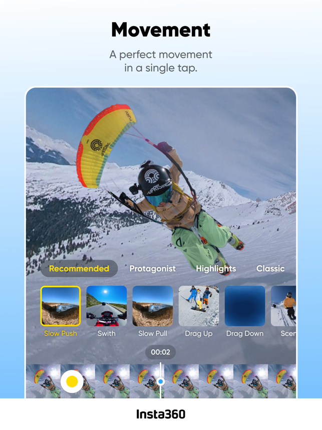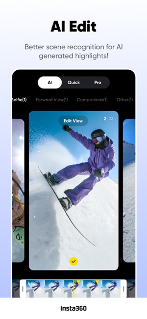 Insta360 cameras and handheld gimbals give creators, athletes and adventurers tools to create like they’ve never created. Whether you’re upping your shooting game with an Insta360 X4, Ace/Ace Pro, GO 3S/3, Flow, ONE X3/X2 or ONE RS/R , the Insta360 app is a creative powerhouse in your pocket that acts as your camera’s sidekick. Let AI do the work with auto editing tools and templates, or dial in on your edit with a host of manual controls. Editing on your phone has never been easier. Quick EditSimply move your phone, swipe the screen or use the virtual joystick to point the camera where you want in you shot.AI EditAI can handle the entire reframing process! Sit back and let your action highlights make themselves, now faster with improved subject detection for even easier editing.Al Highlights AssistantThe Al Highlights Assistant also saves you sorting through hours of footage in post. Like magic, it will edit your latest adventures into one epic video and push it directly to your devic