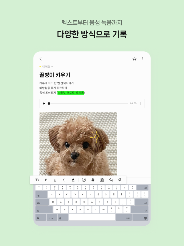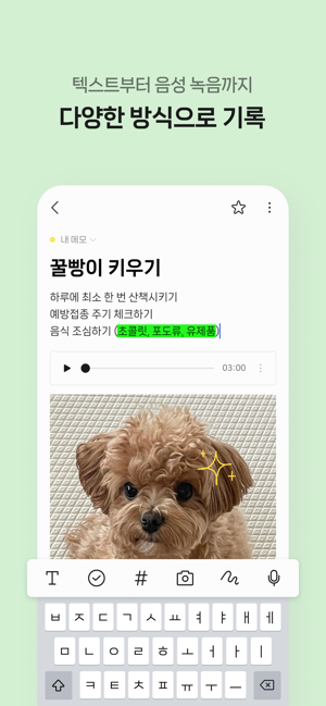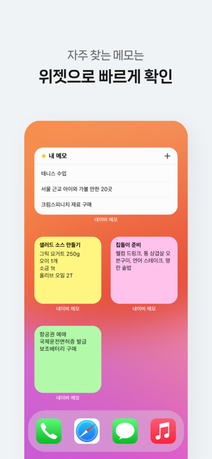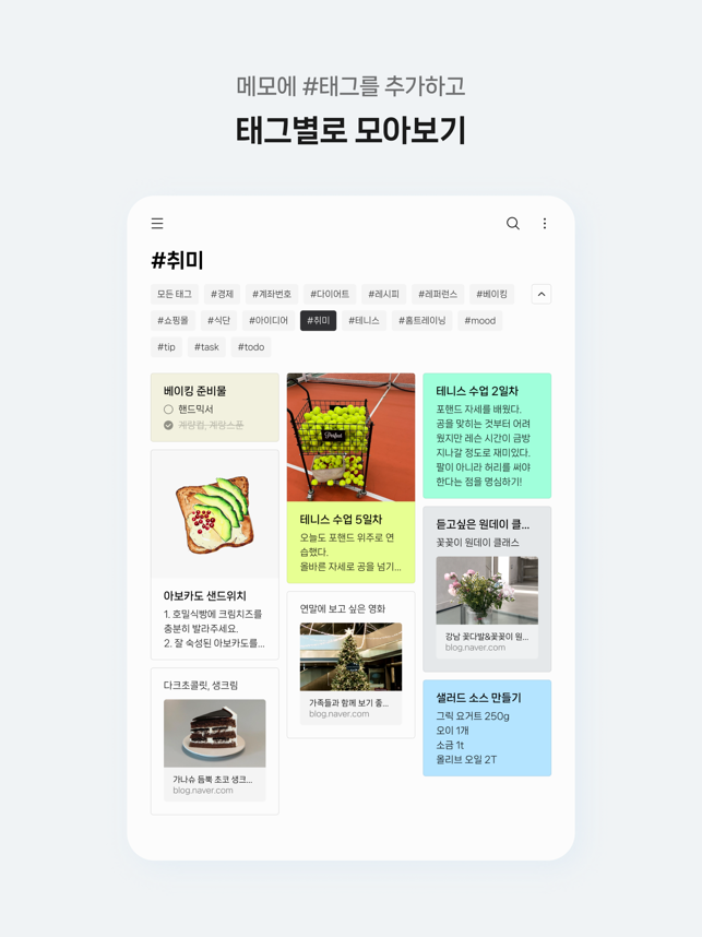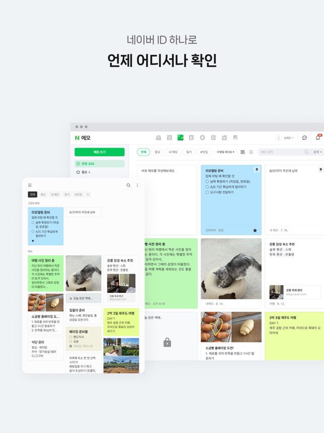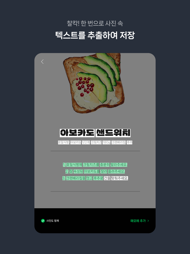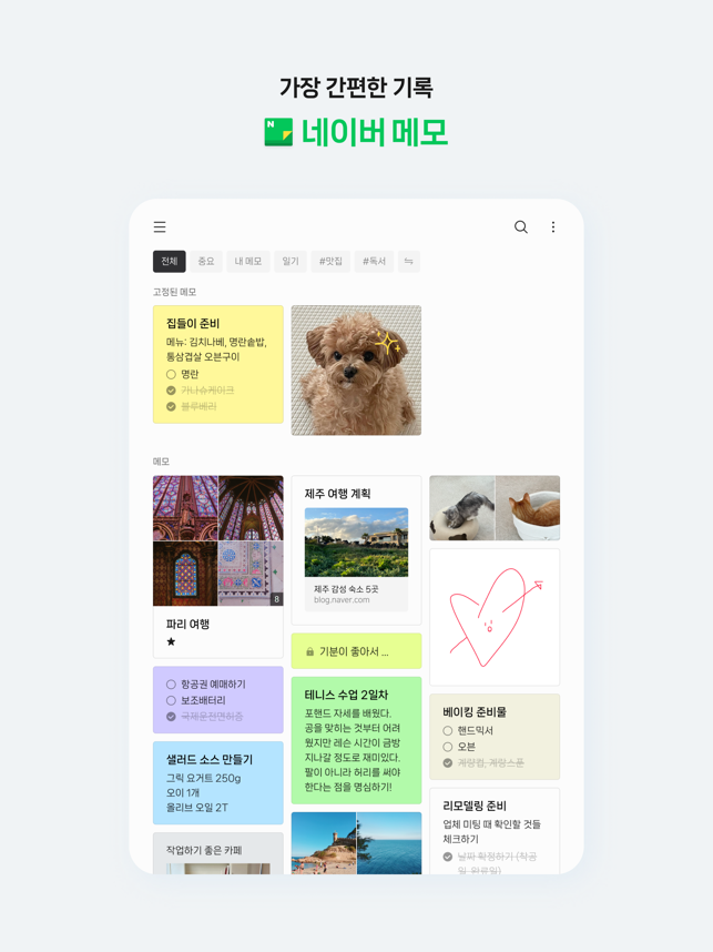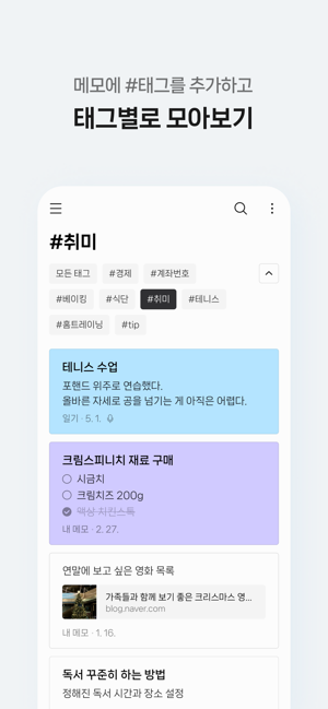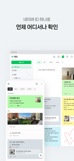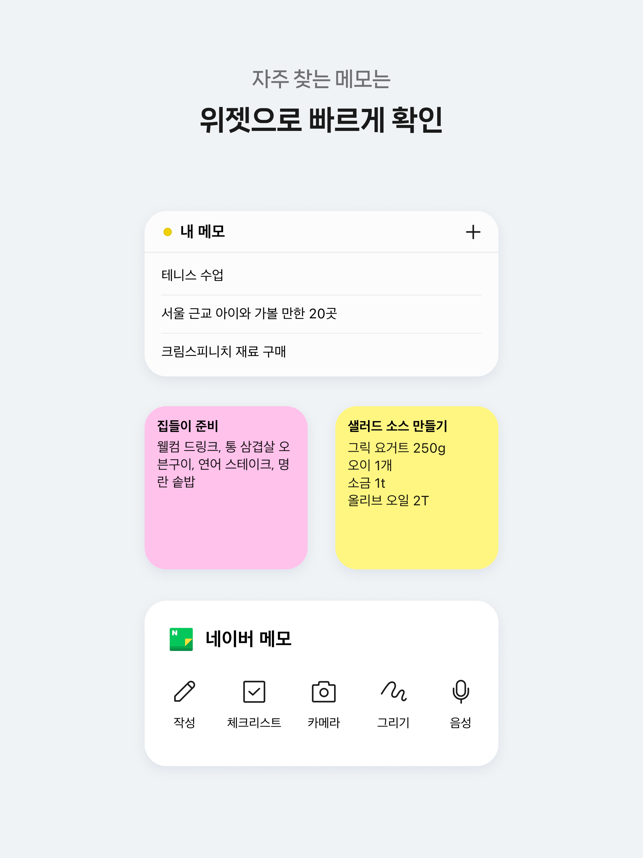 가장 간편한 기록, 네이버 메모에서 시작해 보세요. 1. 언제 어디서나 네이버 메모에 기록하세요.모바일에서도, PC에서도, 언제 어디서나 잊기 전에 작성하고 필요할 때 꺼내보세요. 2. 다양한 방식으로 기록하세요.형광펜, 체크리스트 등 다양한 서식을 이용하여 메모를 작성해 보세요. 찰칵! 한 번에 사진 속 텍스트를 추출하거나, 음성을 텍스트로 변환하여 더욱 편하게 기록할 수 있어요. 3. 작성한 메모를 쉽게 정리해 보세요.폴더와 태그를 활용하면 메모를 쉽게 분류하고 빠르게 꺼내볼 수 있어요.메모에 #태그를 추가하고 태그를 포함하는 메모를 모아보세요. ※ 새로운 네이버 메모 앱 (v4.0)은 iOS 15.0 이상부터 사용할 수 있습니다. [참고 사항]앱 사용 중에 궁금하신 점 또는 문제가 발생한 경우, 네이버 메모 고객센터(https://help.naver.com/alias/memo/memo_new1.naver)로 접속하여 궁금하신 점을 해결해 보세요. -----개발자 연락처: naver_market@naver.com, 1588-3820 경기도 성남시 분당구 정자일로 95, NAVER 1784, 13561