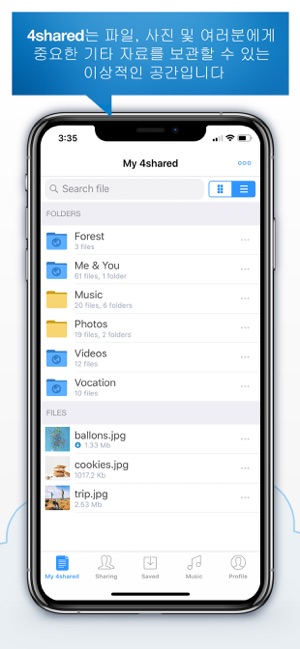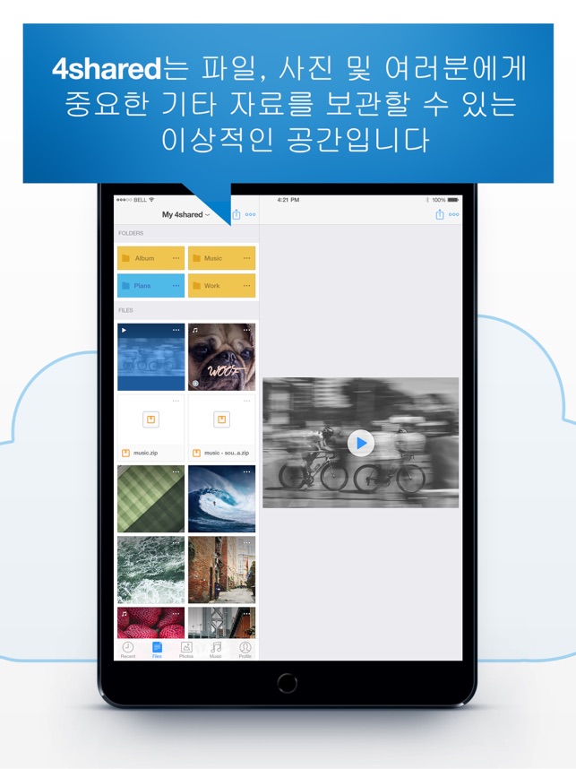 !!!이 애플리케이션은 완전히 무료이며 사용자로부터 청구하지 않습니다!!!4shared Mobile(은)는 15GB의 무료 저장 공간이 있는 4shared에서 개인 안전 클라우드 저장소에서 파일에 액세스하고 관리할 수 있도록 해주는 무료 사용자 친화적인 앱입니다.애플리케이션을 통해 직접적으로 iPhone, iPad 및 연결된 AirPlay 장치에서 비디오를 감상하고, PDF 전자책을 읽으며, (MS Office: Word, Excel, etc.) 및 해야 할 일 목록을 문서화하고, 슬라이드쇼에서 사진 앨범을 찾아보도록 4shared Mobile(을)를 설치합니다.또한, 4shared Mobile(은)는 이동 시 음악에 액세스하고 듣고, 이동 시 권장된 트랙을 스트리밍하며, 자체 재생 목록을 관리하고, 오프라인 모드에서 앱을 통해 직접 좋아하는 트랙을 듣도록 해줍니다.특징:- 4shared 클라우드 저장소로 전체 통합- 고급 파일 및 폴더 관리.- 저장된 파일로의 오프라인 액세스.- 이메일, 소셜 미디어 및 기타 채널을 통해 파일 및 폴더 쉽게 공유.- 향후 액세스 및 장치 간 다운로드를 위해 4shared에서 iPhone 및 iPad로부터의 데이터 백업.- 여러 기능 음악 플레이어(mp3 및 기타 주요 형식 지원).------------------------------!!!!!!!------------------------------앱 환불받고 구매목록 지우려면?제 구매 목록에서 4shared 앱이 보이는 이유는 무엇입니까? 앱 스토어에서 다운받은 모든 앱: 귀하의 구매 목록에 무료와 유료앱이 모두 표시됩니다. 귀하께서 4shared 앱을 다운로드 받으셔서, 귀하의 구매 목록에 나타나게 된 것입니다. 4shared 앱은 유료인가요? 아닙니다, 4shared 앱은 무료입니다. 그러므로, 귀하는 어떤 값도 지불할 필요가 없습니다. 구매 내역이귀하의 아이폰 용량과 영향을 미치고 있습니까?아닙니다, 구매내역은 당신의 아이폰 용량과 아무런 상관이 없다.다만 어떤 이유