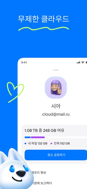 Mail.ru 클라우드 는 사진, 영상, 음악, 프레젠테이션, 문서와 기타 파일을 보관할 수 있는 무료 클라우드 스토리지 서비스입니다. Mail.ru 클라우드 덕분에 모든 사진은 언제 어디서든 접근 가능합니다. 클라우드 스토리지에 업로드된 파일은 모든 기기에서 자동으로 사용할 수 있습니다. 이미지 공유나 문서 공유도 보다 쉽게 할 수 있습니다. 사진, 영상과 파일을 스마트폰에서 클라우드 스토리지로 간편하게 업로드하세요. 카메라 업로드를 사용 설정하면 사진이 자동으로 Camera Uploads 폴더에 업로드됩니다. 데이터 사용량을 줄이기 위해 와이파이(Wi-Fi) 환경에서 업로드 하시길 권장합니다. 모든 사진과 파일은 스페이스 클라우드에 백업되어 있으니. 휴대폰 저장공간을 자유롭게 관리할 수 있습니다. 간편한 이미지 및 문서 공유: 파일, 사진과 폴더는 클릭 한 번으로 친구, 직장동료, 지인 등과 공유할 수 있습니다. 데이터를 아끼는 방법: 이미지 공유나 문서 공유를 위해 SMS, 이메일, 메신저 또는 SNS를 통해 공유링크를 보내면 됩니다. Mail.ru 콜로이드는 인기 있는 사진, 음악 및 영상 파일 형식(avi, mkv, mp4, mov, wmv 포함)을 지원하며,클라우드에서 바로 감상 가능합니다. 파일 다운로드 없이 실시간으로 재생됩니다. 외부 미디어 플레이어 재생도 지원됩니다. 스페이스 콜로이드에서는 문서나 다른 형식의 파일을 바로 열람할 수 있습니다(일부 기기는 추가 프로그램 설치 필요합니다). 세계 어느 곳에 있든 클라우드 박스를 통한 사진과 파일 관리가 가능합니다. 파일명 변경, 삭제, 폴더 이동, 이미지 공유 등 손쉽게 할 수 있습니다.공유폴더를 생성하고다른 사용자와 함께 다양한 파일을 업로드해 보세요. 친구와 함께 여행이나 파티 때 찍은 사진을 한 폴더에 모으면 참 편하겠죠? 직장동료와 폴더를 공유하고 같은 문서를 실시간으로 함께 작업할 수 있습니다. 가족과 만든 소중한 추억을 하나의 앨범에 담아 간직하세요! 중요한 파일을 안전하게 보관하세요