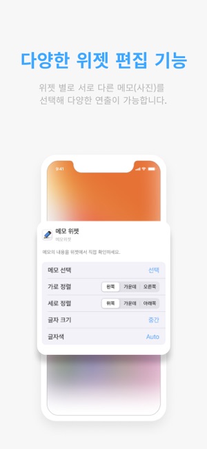 ■ New! 잠금화면 위젯 추가 3가지 종류의 잠금화면 위젯으로 내 메모를 언제 어디서나 손쉽게 볼 수 있어요. #다양한 사이즈 위젯을 사용하여 홈 화면에 자유롭게 배치해 보세요! 메모 내용에 따라서 사이즈를 선택하면 홈 화면에서 메모가 잘 보여요. #원하는 메모를 선택하여 정렬, 글자 크기, 글자색 등을 꾸며보세요!위젯 배경에 따라서 원하는 글자 크기와 색을 조정할 수 있어요. #원하는 사진을 위젯의 배경으로 사용할 수 있어요. 메모 내용이 없어도 홈 화면을 이쁘게 꾸밀 때 사용할 수 있어요. #다양한 컬러와 패턴을 메모별 위젯별로 지정해보세요! 메모위젯 앱에서도 위젯에서도 다양한 컬러와 패턴으로 꾸며보세요. #메모위젯 프리미엄프리미엄 요금제로 업그레이드하고 모든 기능을 제한없이 사용해 보세요(동기화, 광고 제거, 앱 암호 잠금, 다양한 배경 사진 및 패턴 이미지, 사진 업로드 등)#메모 동기화(프리미엄) 동기화를 시작하여 메모를 안전하게 보관하세요. #암호 잠금(프리미엄) 다른 사람이 볼 수 없도록 비밀번호를 설정해보세요.#메모 사진 첨부(프리미엄) 하나의 메모에 사진을 10장까지 업로드 할 수 있어요. - Terms of Use : https://bit.ly/3j197yY- Privacy Policy : https://bit.ly/3l7tkWA- Developer Contacts: 070-7647-1050, help@thedaybefore.me