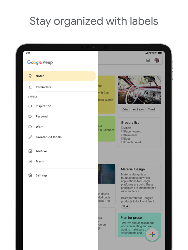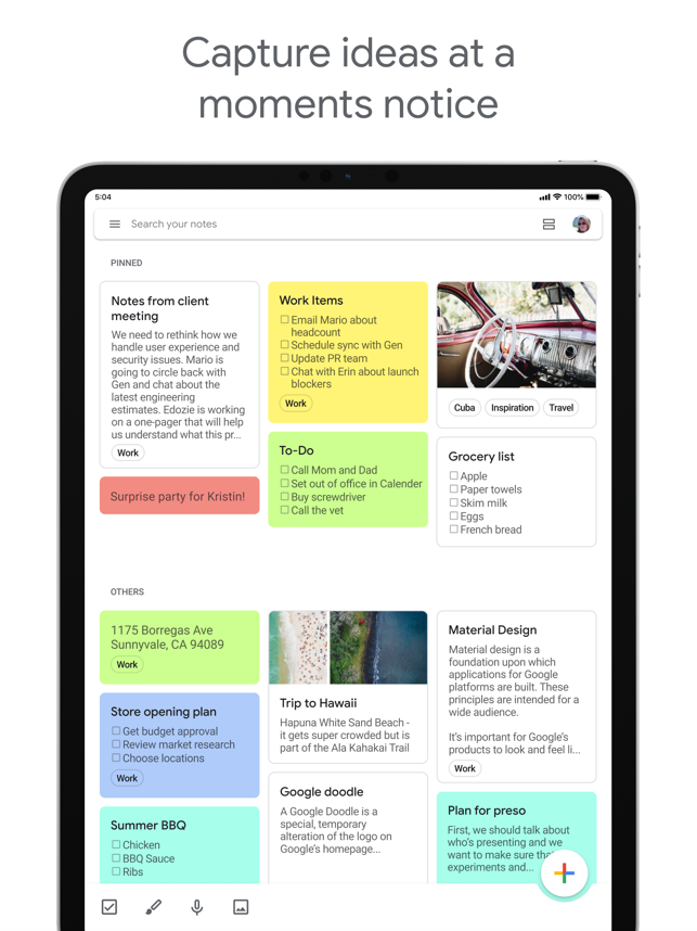 • 어디서나 기기에 상관없이 메모를 캡처, 수정, 공유하고 메모로 공동작업하세요.• Keep에 메모, 목록, 사진, 오디오를 추가하세요.• 메모에 라벨과 색상을 지정하여 정리하세요.• 설정만 해 놓으면 자동으로 알려 줍니다. 장소나 시간을 기준으로 메모에 관한 알림을 받으세요.• 음성 메모를 녹음하고 자동으로 스크립트를 작성하세요.• 이미지의 텍스트를 인식하여 이전에 작성한 메모를 검색으로 빠르게 찾으세요.필요한 순간에 필요한 곳에서오늘 마트에 다녀와야 하는데 잊을까 봐 걱정되시나요? 마트 근처에 도착하면 사야 할 물품 목록이 자동으로 표시되도록 위치 기반 알림을 설정하세요. 해야 할 일이 있나요? 놓치는 일이 없도록 시간 기반 알림을 설정하세요.가족 및 친구와 생각 공유하기다음번 쇼핑을 갈 땐 Keep에서 쇼핑 목록을 공유하여 구매한 상품이 목록에서 실시간으로 체크되는 걸 확인해 보세요. 문자 메시지를 주고받지 않아도 됩니다. 다른 사람과 협력해 더 빠르게 일을 처리하세요.원하는 내용을 빠르게 검색하기색상 및 기타 속성(‘할 일’ 라벨이 포함된 목록, 알림이 포함된 음성 메모 등)으로 메모를 빠르게 필터링하고 검색할 수 있으며 공유 메모를 확인할 수도 있습니다. 원하는 내용을 더 빨리 찾으세요. Keep이 대신 기억해 드립니다.어디서나 이용 가능Keep은 스마트폰, 태블릿, 컴퓨터에서 사용할 수 있습니다. Keep에 추가한 모든 내용이 내 기기 전체에 동기화되므로 중요한 정보를 언제든지 이용할 수 있습니다.웹(http://keep.google.com)에서 Google Keep을 사용해 보고 Chrome 웹 스토어(http://g.co/keepinchrome)에서 찾아보세요.선택 접근권한 안내카메라: Keep에서 메모에 이미지를 첨부하는 데 사용됩니다.연락처: 연락처에 메모를 공유하는 데 사용됩니다.마이크: 메모에 오디오를 첨부하는 데 사용됩니다.위치: 위치 기반 알림을 설정하고 전송하는 데 사용됩니다.저장 공간: 저장 공간에서 메모로 첨부파일을 추가하는 데