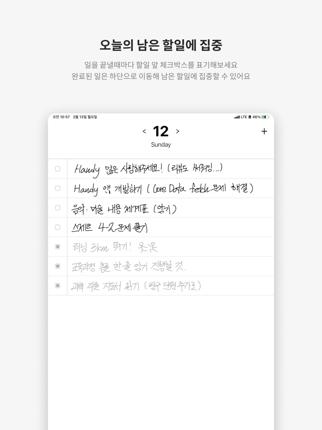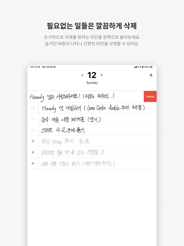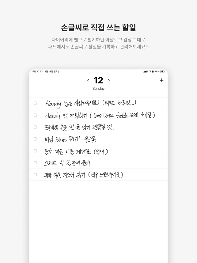 내 할 일은 내 손으로!매일 아침, 여러분의 손글씨로 할일을 기록하고 관리해보세요 :)----------Handy는 필기로 할일을 기록하고 관리하는 To-do 앱입니다.언제 어디서든 할일을 기록하고 싶을 때,여러 권의 플래너 대신에 아이패드 하나로 끝내고 싶을 때,다이어리에 필기하는 아날로그 감성을 살리고 싶을 때,여러분의 곁에는 항상 Handy가 있을거에요.내 손으로 기록한 할일을 하나씩 완료하면서,보람차고 생산적인 하루를 만들어가요.* 할일 관리- 손글씨로 할 일을 추가해보세요.- 필요없는 일들을 삭제해보세요.- 일을 끝냈다면, “완료 버튼”을 눌러보세요.- 완료된 일은 가장 하단으로 이동해요!