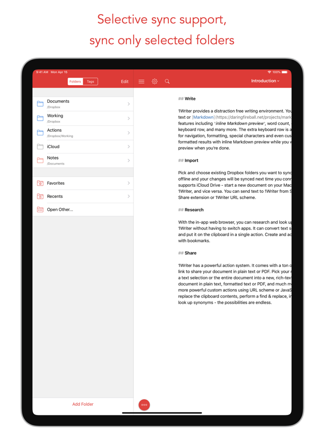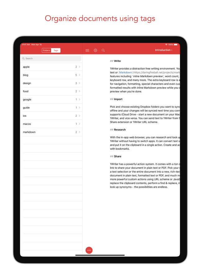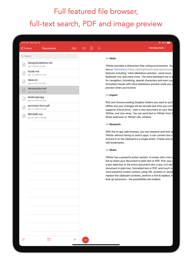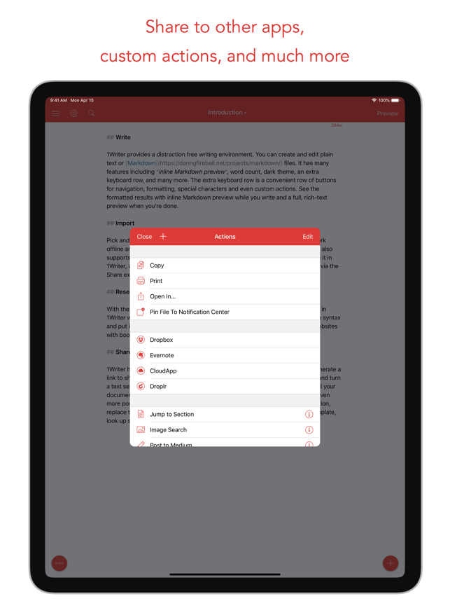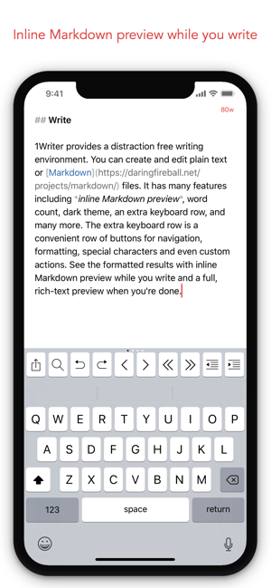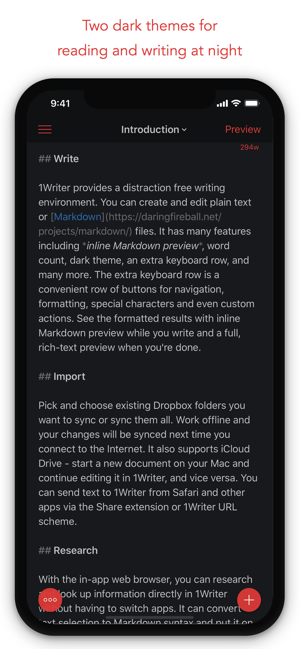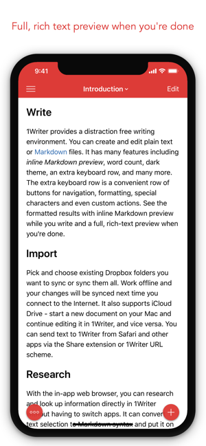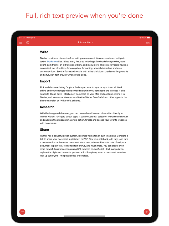 1Writer combines all the basic text editing features you would expect with all the advanced features you will ever need. Use 1Writer to write, research, revise, and share your ideas with maximum efficiency.- - - - - - - - - -"The only Dropbox- and Markdown-enabled text editor for iPhone that’s clicked with me has been 1Writer. It’s simple, looks great, and gets the job done." - TheSweetSetup.com"Really great app, really recommend it." - Federico Viticci, MacStories.net"The app interface is beautiful and distraction-free, with loads of other awesome features lurking beneath its simple exterior. It's now my go-to iPhone text editor." - Chris Gonzales, ToolsandToys.net"For users that want a great visual experience paired with great support for custom actions and third party apps, 1Writer is an excellent choice." - iMore.com"1Writer is the most powerful text editor available for iPhone." - Phillip Gruneich- - - - - - - - - -CREATE- Writ