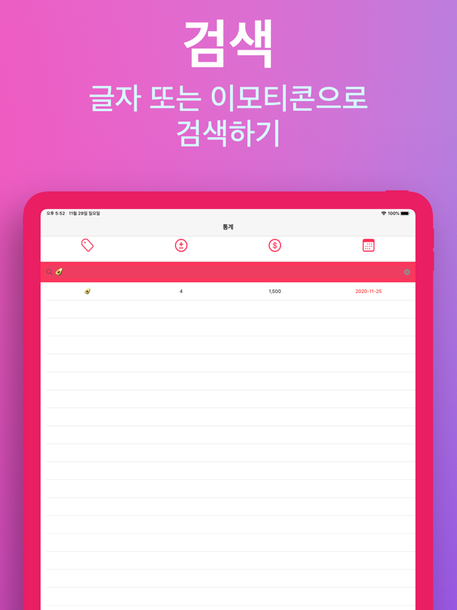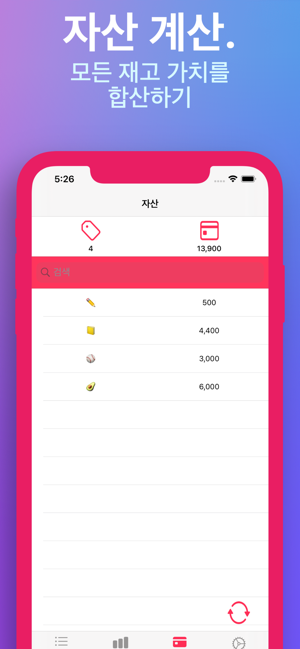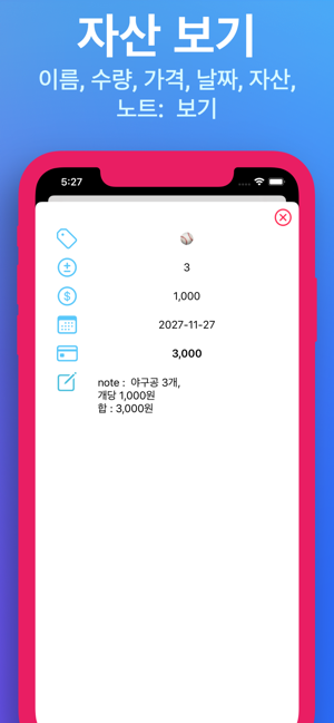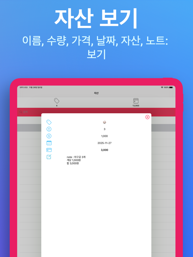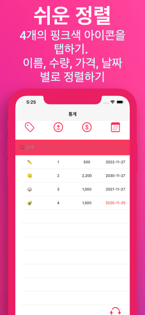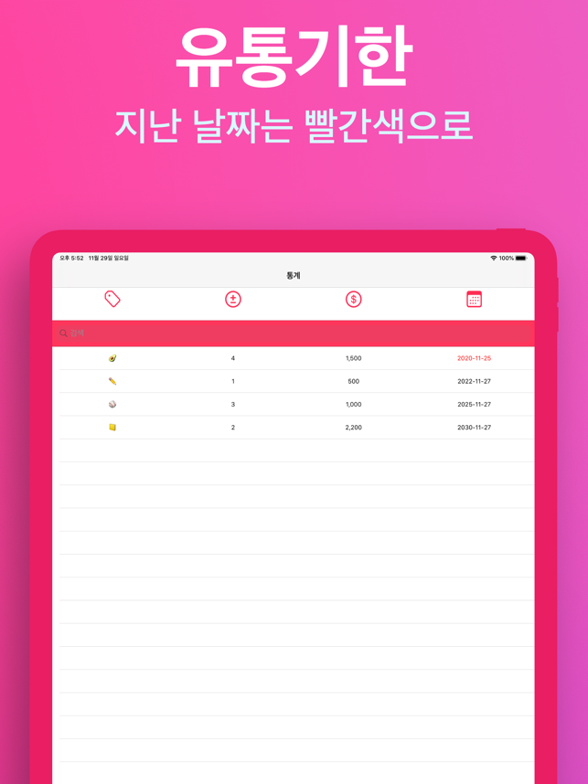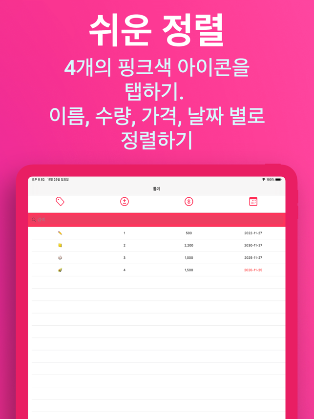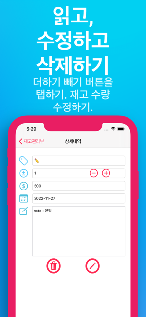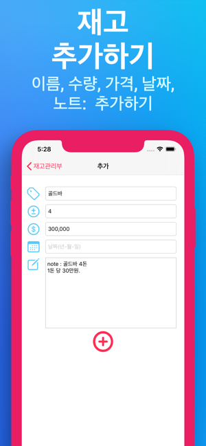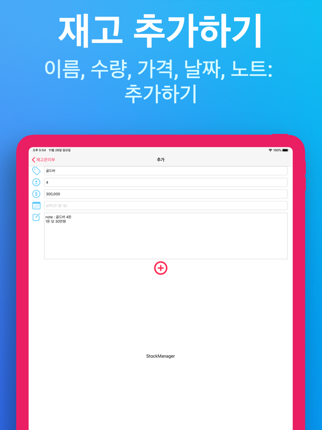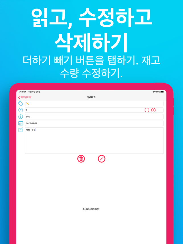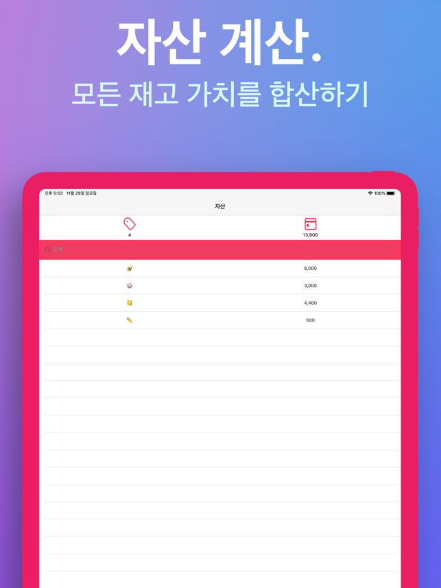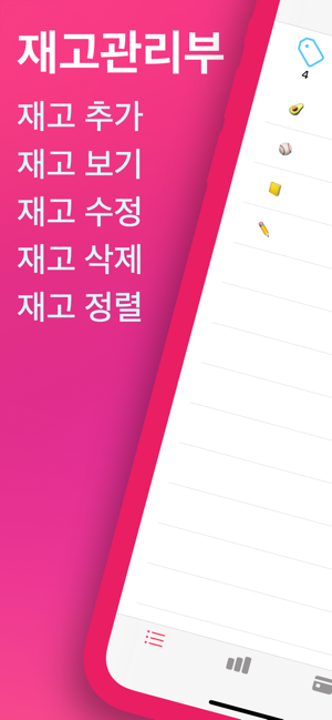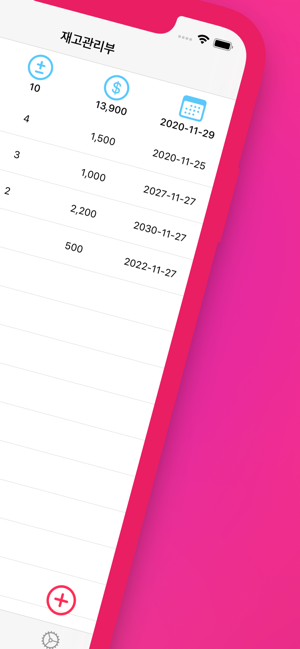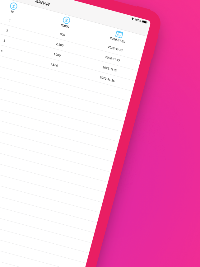 #재고를 관리하기가 매우 쉽습니다.#자산을 휴대 기기에 보관하세요#손안에서 추가,확인,수정,삭제, 정렬 하세요.주식 재고를 기록하고 보관하세요.의약품 재고를 기록하고 보관하세요.생필품 재고를 기록하고 보관하세요.창고 재고를 기록하고 보관하세요.냉장고 재고를 기록하고 보관하세요.귀중품 재고를 기록하고 보관하세요.고가물 재고를 기록하고 보관하세요.금,은,외화 재고를 기록하고 보관하세요.# 쉬운정렬통계 탭에서 이름, 수량, 가격, 날짜 아이콘을 탭하여 각각 정렬할수 있습니다.# 유통기한통계 탭에서 지난 날짜는 빨간색으로 변경됩니다.# 검색통계 탭에서 재고이름을 검색 가능합니다.# 자산계산자산 탭에서 각 재고 자산을 계산합니다. 모든 재고의 자산합을 계산합니다.# 자산보기자산 탭에서 재고를 선택하여 이름, 수량, 가격, 날짜, 자산합, 노트: 를 확인합니다.# 재고 추가재고관리부 탭에서 더하기 아이콘을 탭하여 새로운 재고를 추가합니다.# 읽고 수정하고 삭제하기재고관리부, 통계 탭에서 재고를 선택하여 확인하고, 변경하고, 삭제 할수 있습니다. 수량은 간단히 더하기,뺴기 아이콘을 탭하여 변경 가능합니다.# 문의하기soojinlab@gmail.com