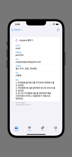 더 이상 메모장에 아이디와 비밀번호를 기록하지 마세요.myPass 하나로 로그인 등 각종 보안 정보들을 안전하게 관리하고, 암호 자동 완성 기능으로 빠르게 거침없이 로그인 하세요.********** 대표 핵심 기능 ********** - 암호 자동 완성 공식 지원 - 홈스크린 위젯, 락스크린 위젯 지원 - 파일앱을 통한 데이터 백업, 복원 기능 - 강력한 비밀번호 자동 생성 기능********** 강력한 보안 ********** - AES(Advanced Encryption Standard) 256비트로 데이터 암호화 적용 - 자체 서버를 운영하지 않고 모든 데이터를 개인 디바이스 로컬에 저장(서버 해킹의 위험이 없어요!) - 백그라운드 진입 시 자동 잠금 기능 - 일정 시간 미사용 시 자동 잠금 기능 ********** 탄탄한 기본 기능 ********** - Touch ID, Face ID 인증으로 빠르고 안전하게 잠금 해제 - 아이템 검색할 때 한글 초성검색 지원 - 아이템이 10개 넘는 카테고리에서는 헤더 인덱스 기능 지원(우측 첫글자 버튼으로 빠른 이동) - 아이템 필드별 클립보드 복사 기능(필드 long-tap) - 아이템 리스트에서 정렬 기능(이름순, 날짜순) - 복사본 만들기 기능으로 유사한 내용의 아이템을 빠르게 추가 - 필드 편집 기능으로 아이템별 개별 필드들의 커스터마이징(추가, 삭제, 이동) 가능 - 즐겨찾기 기능으로 자주 보는 아이템을 빠르게 접근 - 즐겨찾기 순서 변경 기능(위젯 순서 반영) - 태그별 폴더 자동 생성으로 태그별 모아보기 기능(멀티 태그 가능) - 태그 입력 시 등록된 태그 중에서 선택 가능 - 바코드 이미지 자동 생성 기능 (바코드 카테고리) - URL필드는 사파리에서 열기 지원 - 전화번호 필드는 메세지 보내기와 전화 걸기 지원 - 이메일 필드는 이메일 보내기 지원 - 다크모드 지원 myPass의 웹사이트(블로그)에 사용자 가이드가 안내되어 있으니 참고해 주세요.https://mypassapp.blogspot.com