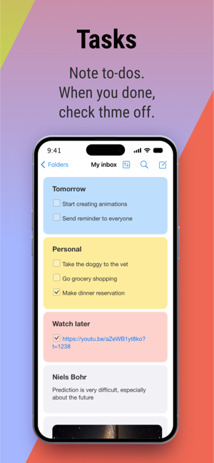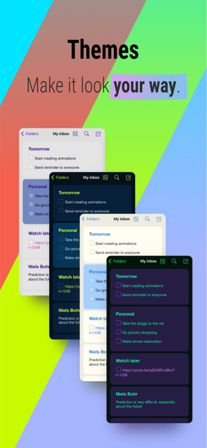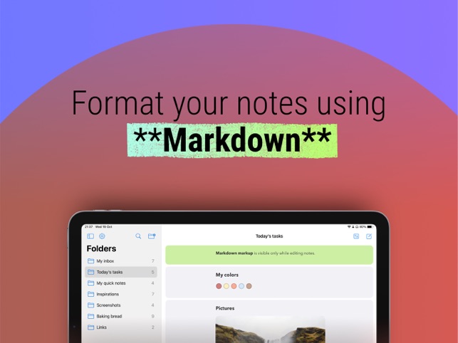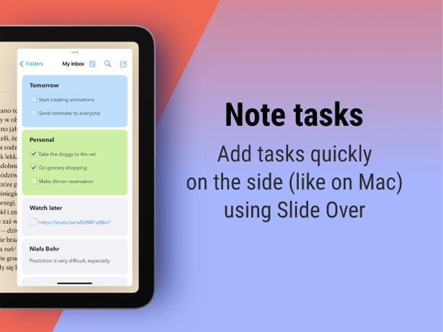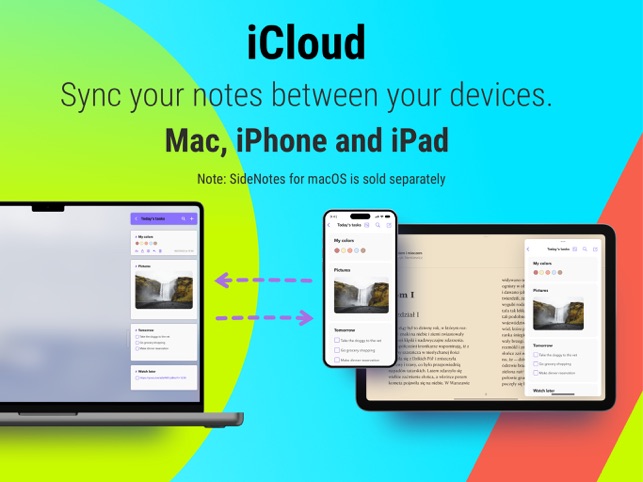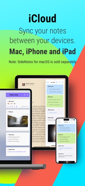SideNotes is an application for making quick notes. Originally, it was created for macOS only to take notes on the side of the screen. This application is an iOS / iPadOS version of SideNotes. It allows you to take your notes comfortably wherever you are.Features:- iCloud Synchronization - to synchronize your notes between your devices - Markdown - to format your notes; markdown markup is visible only while editing notes- Tasks - to keep up with your daily duties- Themes - to personalize you SideNotes- Note colors - to highlight important things- Note and Folder URLs - to get to any note or folder from a different app- Text settings - to adjust text view to your needsPlease note that SideNotes for iOS / iPadOS isn't an exact copy of the desktop version. SideNotes for macOS is also sold separately.The look and feel are very similar, your notes are all editable, but there are some differences. For example, this app doesn't provide file shortcuts.