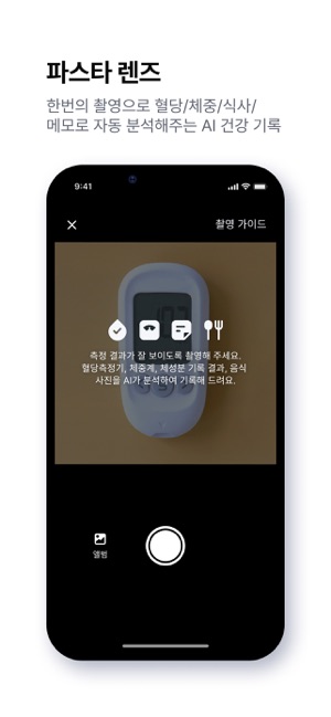 혈당 관리를 위한 나만의 라이프 레시피가 시작됩니다. 센서를 착용하고 개인 건강 데이터를 입력해, 실시간으로 변화하는 혈당을 직접 눈으로 확인하세요. • 파스타는 식품의약품안전처로부터 2등급 유헬스케어 게이트웨이 소프트웨어로 허가받은 의료기기이며, '사용상의 주의 사항'과 '사용 방법'을 잘 읽고 사용해 주세요.• 연속혈당측정기(CGM)는 구성품에 포함되지 않습니다. 아래 파스타몰에서 구매하실 수 있어요. https://pastahealth.com/※파스타 몰 및 카카오헬스케어와 제휴된 채널을 통해 구입하신 연속혈당측정기를 PASTA 앱에 연결하여 사용하실 수 있으나, 이외의 곳에서 구매하신 연속혈당측정기를 PASTA 앱에 연결할 수 없거나 연결되더라도 일부 주요 기능의 사용이 제한될 수 있음을 미리 알려드리오니 숙지해주세요. [파스타 주요 기능]1. 다이어리센서를 착용하고 식사, 운동 등 생활 습관을 기록하세요.혈당과 생활 습관과의 관계를 실시간으로 확인할 수 있어요.2. AI 음식 인식 - 푸드샷간편하게 식사를 기록하세요.사진만 찍어도 음식을 자동 인식해서 음식명과 영양 정보, 혈당 정보까지 확인할 수 있어요.3. AI 음성 기록말로 더 쉽고 편하게 건강 데이터를 기록하세요."아침으로 시리얼 먹었어.""나 아침 6시에 웨이트 1시간하고 닭가슴살 먹었어."4. AI 이미지 분석 - 파스타 렌즈사진 촬영 한번으로 더 빠르게 건강 데이터를 기록하세요.- 자기혈당측정기(BGM) 화면- 체성분 검사 결과지 및 스마트 체중계 화면- 건강에 유용한 텍스트가 담긴 이미지5. AI 챗봇궁금한 건강 정보를 쉽게 질문하고, 맞춤 답변 받으세요.“당뇨병이란?”“당뇨병은 어떻게 관리해야 하나요?”6. 리포트혈당 데이터와 생활 습관 기록을 꼼꼼하게 분석한 나만의 맞춤형 리포트를 제공해요.*AGP 보고서를 확인하고 다운로드 할 수 있어요.7. 혈당 공유친구, 가족과 혈당 데이터부터, 식사, 운동, 복약기록 등 원하는 건