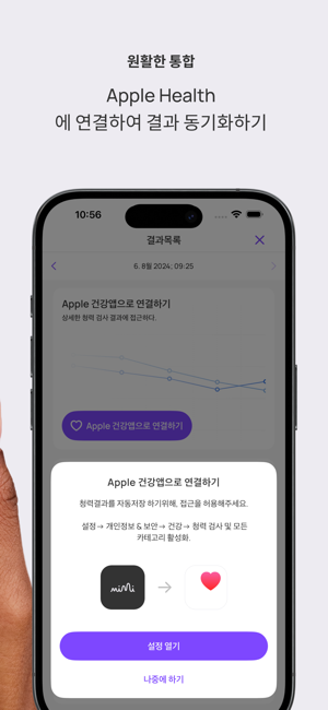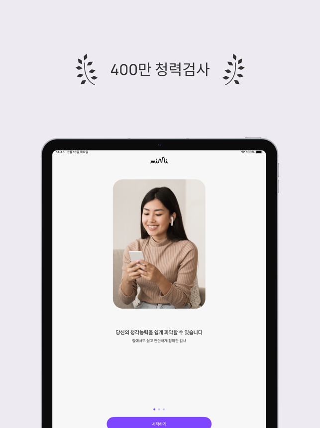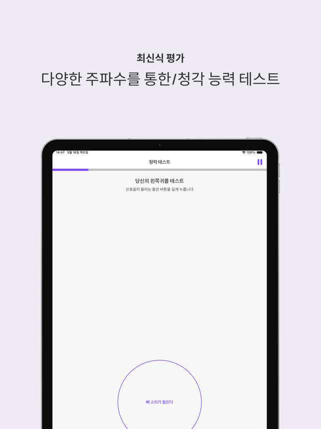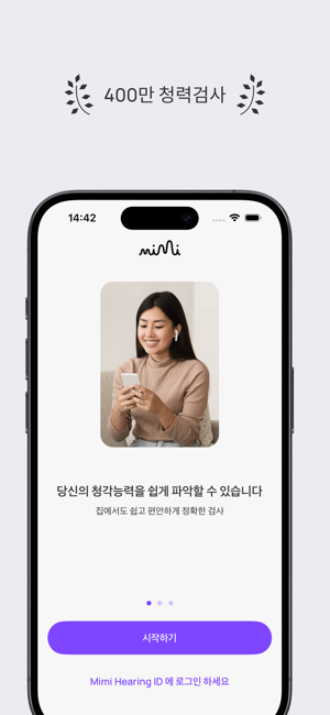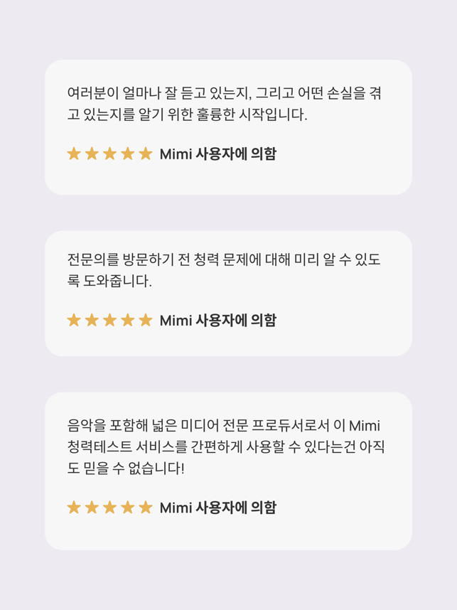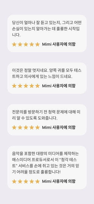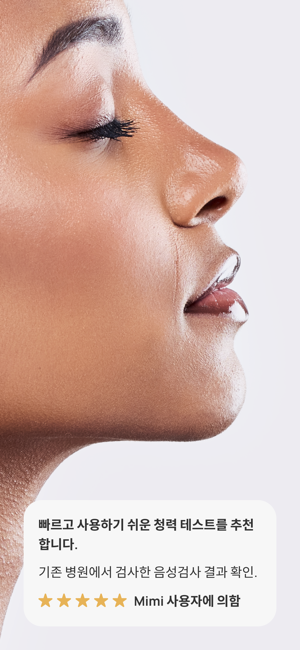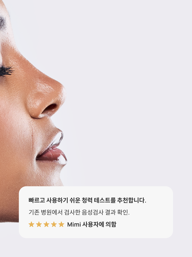 앱스토어에서 N1 청력 테스트 앱으로 5분 안에 청력을 검사하세요! 선명한 결과를 확인하고, 변경 사항을 추적하고, Apple 헤드폰과 동기화하세요. Apple이 지원하는 헤드폰에 적합합니다.미미 청력 테스트는 당신의 청력을 쉽고 신뢰할 수 있는 평가로 단 5분 만에 알맞은 결과를 제공합니다.- 현대적인 평가: 광범위한 주파수를 신속하고 철저하게 테스트합니다.- 즉각적인 결과: 청각 데이터로부터 당신의 청력을 더 잘 이해할 수 있는 가치있는 통찰력을 얻습니다.- 원활한 통합: Apple Health 앱에 연결하여 동기화하고 결과를 비교할 수 있습니다.- 모니터 청력 : 시간에 따른 청력의 변화를 추적합니다.- 내보내기 결과: 결과물을 PDF로 저장하여 가족 또는 의료 전문가와 쉽게 공유 가능합니다.(특정 지역에서만 사용 가능)미미의 혁신적인 기술을 활용하여 400만건 이상의 청력 검사를 진행하여 세계 최대 규모의 디지털 청력 프로파일 데이터베이스 개발에 기여하고 있습니다.미미와 연결하시겠습니까?당사 웹사이트를 확인하십시오. mimi.io 인스타그램: @mimihearing제한사항테스트 정확도는 헤드폰 종류와 주변 소음 수준에 따라 달라집니다. 지원되는 모델은 Apple EarPods, AirPods(1, 2, 3, 4세대), AirPods Pro(1, 2세대), AirPods Max, Powerbeats Pro, Beats Fit Pro 등입니다. 다른 헤드폰을 사용할 수 있지만 결과는 정확도가 떨어질 수 있습니다. Mimi 테스트는 청력에 대한 초기 평가 역할을 합니다. 항상 의료 전문가의 조언을 구하십시오.면책조항이 Mimi Hearing Test 앱(그 안에 제공된 모든 콘텐츠 포함)은 의학적 조언이나 진단을 구성하지 않습니다. 의학적 조언과 진단의 제공은 귀하의 의사 또는 기타 의료 또는 자격을 갖춘 의료 전문가의 책임이며, 귀하의 청력과 관련된 문제 또는 질문이 있는 경우 상담을 받아야 합니다.이 앱은 ANSI/CTA-2118 기준을 따르며, 소비자의