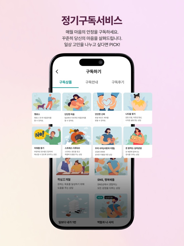 1. "마인드, 핏" 신상품이 런칭 되었어요. 멜킨바이크와 운동심리상담의 만남 최대32% 할인받고 시작해보세요.2. 수면으로 힘들어하는 당신 "꿀잠 프로젝트"를 시작해보세요. 영양제와 수면상담의 콜라보 상품2. 구독상품이 리뉴얼 되었어요. 퀘스트를 풀며 마음을 탐구해보아요.3. 매일매일 마음을 기록해 보아요. 전문상담사가 피드백을 드립니다.4. 앱리뷰 이벤트를 진행해요. 리뷰달고 선물받고! 메인 UI 수정 및 기능이 개선되었어요.