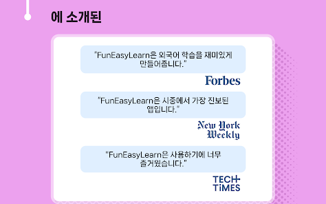 FunEasyLearn은 언어 학습에 혁명을 일으키고 있습니다 언어학자들과 교사들로 구성된 우리 팀은 독특한 언어 학습 전략을 개발해 냈습니다 비결은 알파벳과 모든 읽기 규칙 필요한 단어 그리고 실용적인 구절을 하나의 어플로 결합하는 것이었습니다 사용자들이 단어나 문장을 읽고 정확하게 발음하고 이미지 와 연관시키고 그것을 듣고 쓰고 말하는 게임으로 연습할 수 있게 도와줍니다