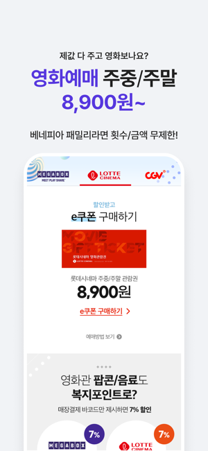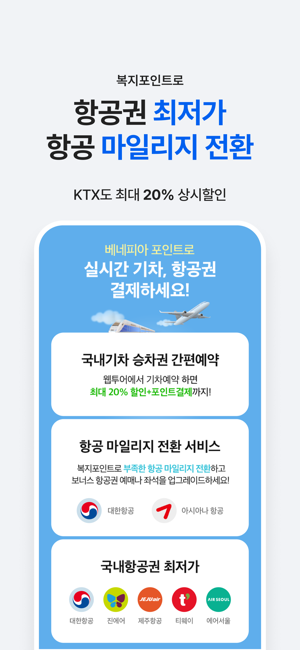 유쾌한 일상, 복지 서비스 베네피아다양한 복지 서비스를 이용할 수 있는 베네피아, 지금 다운로드해보세요. [건강관리]-가족까지 임직원가로 건강검진을 받을 수 있어요 -걸으면 리워드가 쌓여요, 베네fit [모바일 쇼핑]-“화끈딜”을 통한 특정 상품 최저가, 매일 1천원 할인 쿠폰, 최저가 보상 무료 반품, 배송지연보상-“스마트폰전문관”을 통한 스마트폰 알뜰하게 구매 -인기 브랜드별 e쿠폰 [바로가게]-오프라인 매장에서 바코드 띄워서 포인트로 바로 결제 (신용카드 사용하고 차감 신청하는 번거로움이 없음)-횟수 제한 없이 마트/백화점/편의점 2%, 카페/베이커리 3%, 패스트/외식 5%, 생활/여가 7% 할인-소득공제도 신용카드 대비 2배[여행] -한화/금호 리조트 및 호텔 특가 숙박 제공[편리성 및 혜택]-로그인 및 포인트 사용을 간편하고 안전하게 핀/패턴/생체인증 방식으로 가능-상시 기획전 및 이벤트 참여한국관광공사근로자 휴가지원사업 참여자는 휴가지원 전용 모바일 휴가샵을 이용해 주세요. http://m-vacation.benepia.co.kr경기도일자리재단 청년복지포인트 및 라이나생명은 전용 APP ‘경기청년몰’, ‘라이나케어멤버십’을 설치하고 이용해 주세요.◆참고 사항 1) 대상 단말-해상도 HD급 이상 스마트폰에서 이용 가능하며, OS 버전에 따라 일부 기능을 지원하기 어려운 점 양해 바랍니다.*버전 권장사양 : iOS 버전 13.0 이상 ◆접근권한 안내 [필수적 접근권한 없음][선택적 접근권한]▶알림: 서비스 변경내용, 이벤트 등 알림 메세지 수신▶동작 및 피트니스: 걷기서비스 걸음수 측정 시 사용▶연락처: 친구초대, 걷기서비스 친구 추가 시 사용▶위치: 내 주변 매장 검색 시 사용 ▶사진/카메라: 관리자/영수증 승인신청, e쿠폰, QR명함, 사진이벤트 참여, 최저가보상 신청 시 사용▶Face ID: 간편인증 시 사용선택적 접근권한 허용에는 동의하지 않아도 서비스 이용이 가능합니다-베네피아는 생체인증 정보를 별도로 수집하지 않으며 이용자의 단