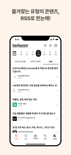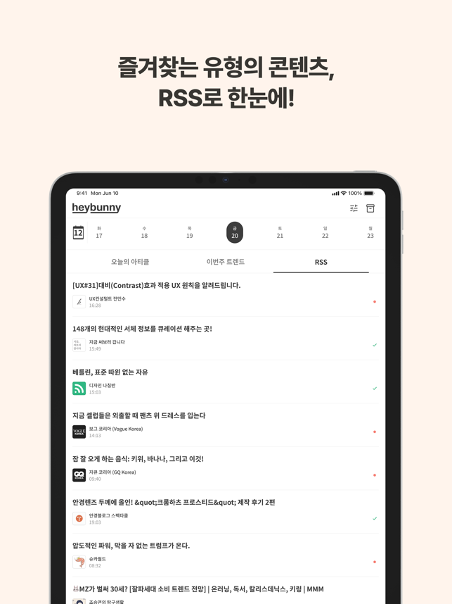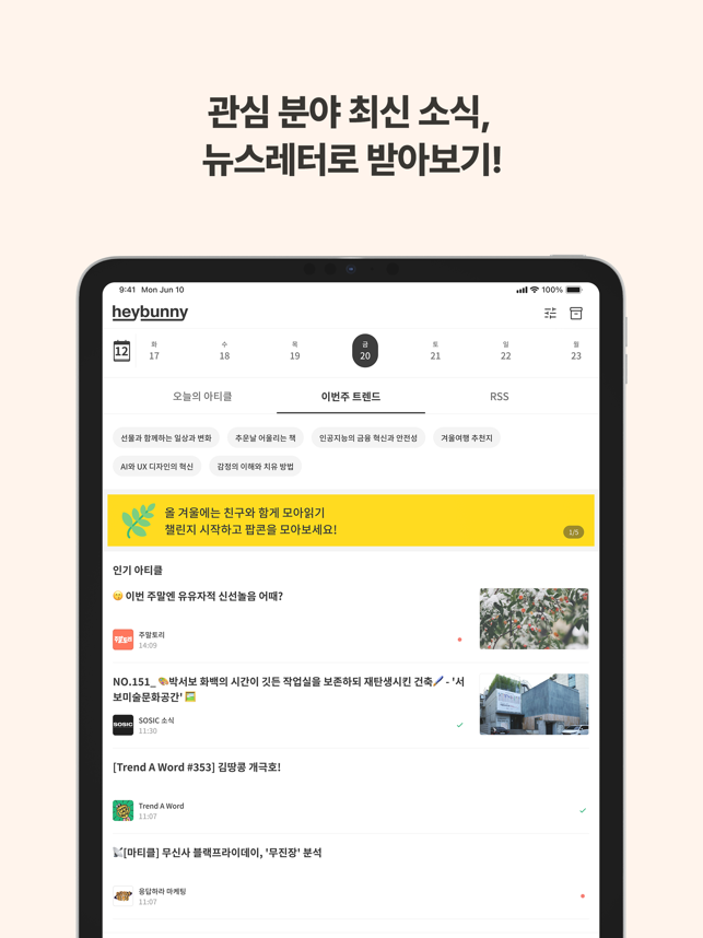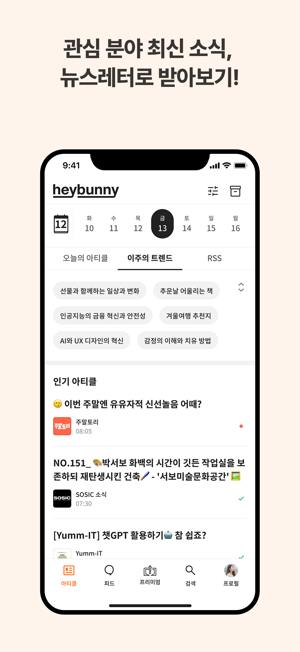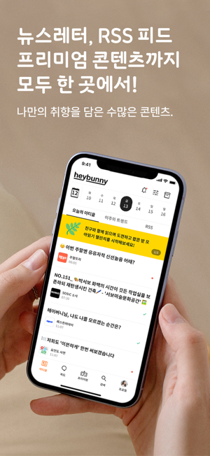 국내 해외 핫 이슈, IT, 경제, 테크, 인문학, 엔터, 제테크, 마케팅 모든 분야의 트렌디한 뉴스레터, 찾지 말고 추천 받아 보세요.헤이버니가 필요한 순간들• 매일 아침 메일 박스에 뉴스레터들 쌓아두기 vs. 헤이버니 계정으로 깔끔하게 받아보기 • 메일 박스 용량으로 예전 메일 골라서 삭제하기 vs. 용량 걱정 없이 헤이버니 앱에서 받아보기 • 필요한 뉴스레터 매일 1시간씩 찾고 구독하기 vs. 헤이버니로 원하는 카테고리의 뉴스레터 간편하게 구독하기• 저장하고 싶은 뉴스 ctrl C + V 무한 반복하기 vs. 헤이버니 앱에서 하이라이트로 내 보관함에 저장하기 • 영어공부를 위해 구독한 해외뉴스 번역만 30분 쏟기 vs. 헤이버니 앱 번역기능으로 3초만에 번역하고 영어공부 하기• 공유하고픈 정보 나만 혼자 알고 있기 vs. 헤이버니 피드에 내 생각 공유하고 친구들과 토론하기헤이버니 앱을 추천하는 이유• 무료로 내 취향의 뉴스레터를 마음껏 구독하고 아티클을 무제한으로 읽을 수 있어요.• 나와 비슷한 취향의 사람들이 가장 많이 구독하는 뉴스레터를 알려 드려요.• 나 혼자 읽는 뉴스레터가 아닌, 친구들과 함께 모아 읽기 챌린지로 매일 목표를 정해서 같이 읽어요.• 내가 좋아하는 크리에이터의 특별한 프리미엄 콘텐츠를 읽을수 있어요. 주요 기능• 멤버십으로 프리미어 아티클 무제한 열람하기• 멤버십으로 RSS 리더 콘텐츠 소식 한곳에서 받기• 멤버십으로 광고 빼고 읽는 즐거움에 몰입하기• 인공지능이 분석한 오늘의 트렌드 살펴보기• 구독 전용 이메일 주소로 뉴스레터만 모아 읽기• 새로운 아티클이 오면 알림 받기• 매일 뉴스레터를 읽으면서 받은 쿠폰으로 다양한 상품권, 기프트카드, 교환권에 응모하기• 번역 기능으로 외국어 아티클 한국어로 편하게 읽기• 아티클 스크랩, 문장 하이라이트로 잘 보관하고 쉽게 찾기• 피드에서 내 생각 공유하며 소통하기• 모아 읽기 챌린지로 친구들과 함께 뉴스레터 읽는 습관 만들기[온라인 채널]웹사이트 : https://heybunny.io