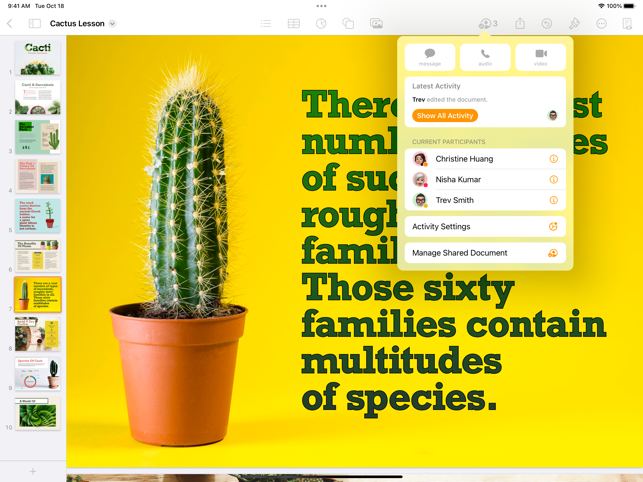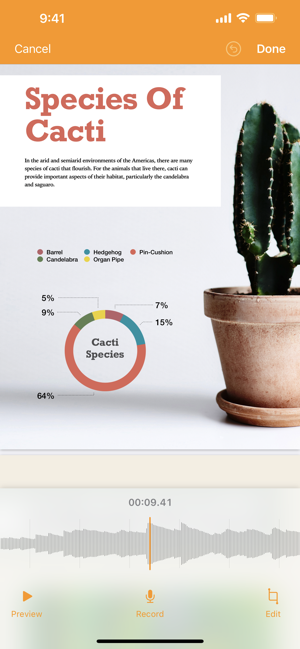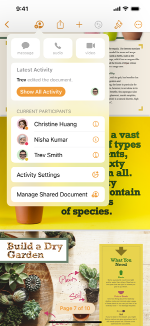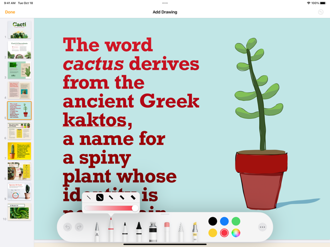 Pages는 지금껏 본 적 없는 가장 근사한 모바일 기기용 워드 프로세서입니다. Apple에서 디자인한 템플릿으로 매력적인 보고서, 디지털 책, 이력서, 포스터 등을 만들어 보십시오. 아니면 빈 문서를 사용하여 나만의 디자인을 생성해 보십시오. 이미지, 동영상, 오디오, 표, 차트 및 도형을 쉽게 추가할 수 있습니다. 지원되는 기기에서 Apple Pencil이나 손가락을 사용하여 그림을 그리고 주석을 추가할 수도 있습니다. Pages는 iPad 및 iPhone 전용으로 디자인되었습니다.Apple Pencil 또는 손가락을 사용하여 그림을 그리거나 주석 작성하기• 펜, 연필, 크레용 및 채우기 도구를 사용하여 쉽게 그림을 추가한 다음 살아 움직이는 것과 같은 애니메이션 효과를 줄 수 있음• 스마트 주석을 사용하여 관련 텍스트에 고정되는 주석 및 표시를 추가할 수 있음• 손글씨 입력 및 Apple Pencil을 통해 손글씨를 입력한 텍스트로 변환할 수 있음다른 사람들과 동시에 공동 작업하기• 실시간 공동 작업을 통해 Mac, iPad, iPhone뿐만 아니라 PC에서도 팀원 전체가 한 문서에서 동시에 작업 가능문서를 공개적으로 공유하거나 특정 사용자와 공유하고, 현재 문서에 있는 사용자를 확인하고, 다른 사용자의 커서를 보고 편집 내용을 확인할 수 있음사람들이 참여하고, 주석을 달고, 편집할 때 등 공동으로 작업하는 문서의 최근 변경 사항 목록을 볼 수 있음• iCloud 또는 Box에 저장된 문서에서 사용 가능아름다운 문서 만들기• iPhone의 화면 보기를 통해 텍스트, 이미지 및 기타 요소를 화면에 맞도록 자동으로 최적화하여 표시• 90개 이상의 Apple이 디자인한 템플릿 중에서 선택 가능• 700개 이상의 편집 가능한 도형이 담긴 보관함으로 문서를 더욱 향상할 수 있음• 이미지, 비디오 및 오디오를 손쉽게 추가할 수 있음• 이미지 갤러리를 추가하여 동일한 페이지에서 사진 모음을 볼 수 있음• 다른 사람과 공유하거나, 다운로드 또는 구입할 수 있도록 App