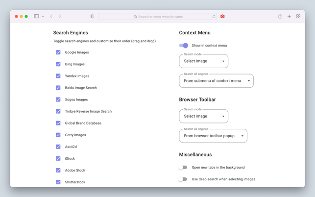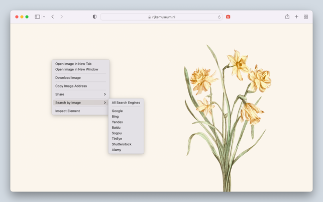 Search by Image is a powerful browser extension for Safari that makes effortless reverse image searches possible, and comes with support for more than 30 search engines, such as Google, Bing, Yandex, Baidu and TinEye.Search by Image is an open source project made possible thanks to a community of awesome supporters. By purchasing the extension on the Mac App Store, you help support the continued development of the extension.The extension helps journalists and researchers verify the authenticity of images, and assists in the identification of false information on social media. Search by Image is also popular among photographers, helping artists explore how their work is shared on the web, while shoppers find it valuable for discovering similar products at discounted prices.The extension enables you to search for images from the context menu and the browser toolbar with the help of a diverse set of reverse image search engines, which can be toggled and reordered from the extension's