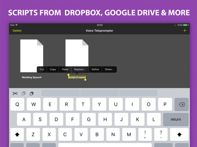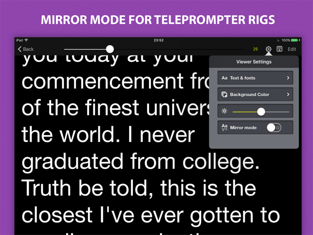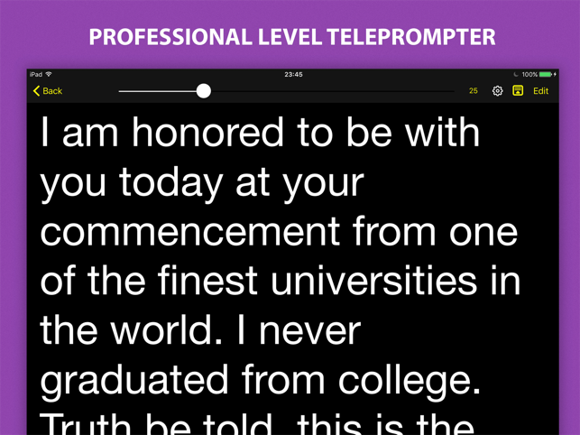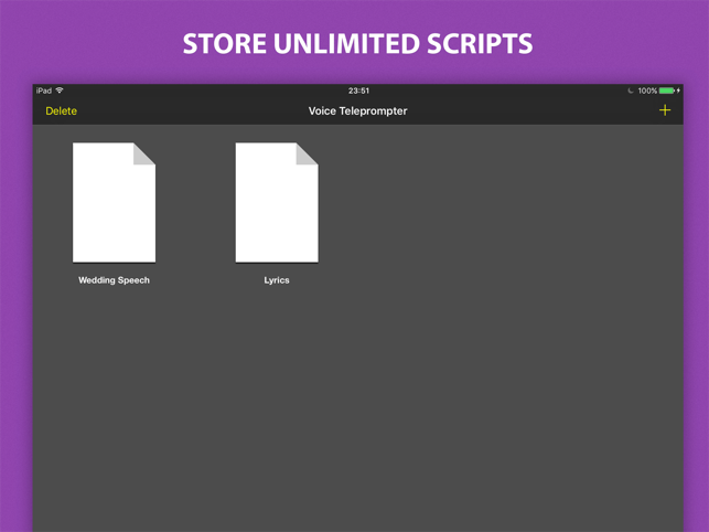Voice Teleprompter automatically scrolls with the sound of your speech! If you stop talking, your script stops scrolling. A truly professional prompter app. If you need to take a break, you don't need to worry about losing your place. Teleprompter Voice Pro is a professional app for presentations, video producers, vloggers, musicians, priests, pastors, teachers, presenters, keynote addressers, MC's, toastmasters, wedding speeches and much more. The app picks up the audio using the device's built-in microphone. As the app uses audio level technology and not voice recognition to scroll the script, all languages are supported! Features:- Unlimited Scripts- Import your Scripts from Dropbox, Google Drive, Mail, Your files, Anywhere else! - Scroll your script at any speed you need- Change the colours and background of your script- Mirror mode for professional use