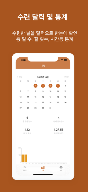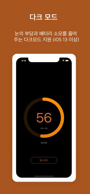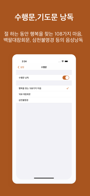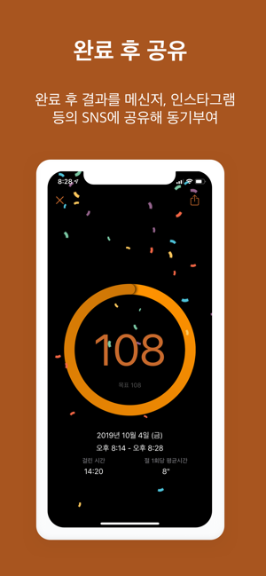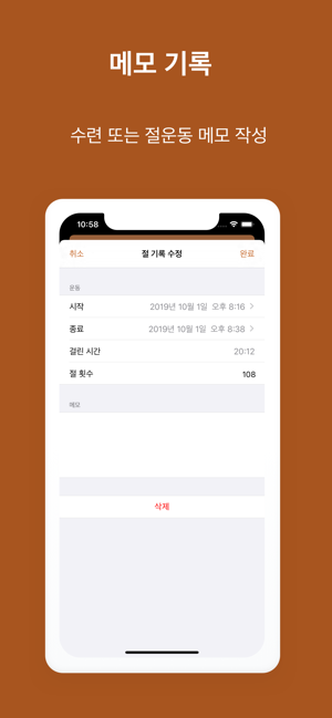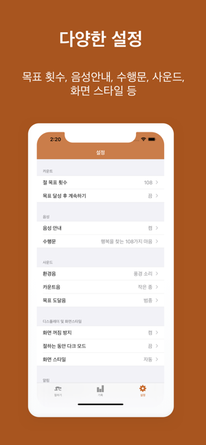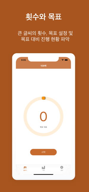 108배는 iPhone의 근접센서로 자동으로 절 동작을 인식하고 음성으로 횟수를 세주고 기록해주는 앱입니다. 자동으로 절을 인식해서 말로 세주는 108배 수행◉ 이런 분께 좋습니다. 108배 다이어트, 108배 절 운동, 108배 수행하시는 분◉ 절 할 때 숫자를 세지 않아도 됩니다아이폰의 근접 센서로 자동으로 절을 인식해서 횟수를 세줍니다. ◉ 음성 가이드절 할때 마다 횟수를 음성을 세줍니다. ◉ 환경음 절 하는 중에 집중할 수 있게 풍경 소리를 들을 수 있습니다. ◉ 수행문, 기도문 낭독절 하는 동안 수행문 또는 기도문을 들을 수 있습니다. 수행문/기도문: 행복을 찾는 108가지 마음, 백팔대참회문, 삼천불명경◉ 완료 후 결과 보기 완료 후 절 횟수, 경과 시간, 1회당 평균 시간, 소비 칼로리등의 결과를 바로 확인할 수 있습니다. ◉ 결과를 메신저나 SNS로 공유 인스타그램 크기에 맞는 이미지로 친구에게 공유하고 동기부여를 받을 수있습니다. ◉ 수동 입력앱으로 카운트하지 않은 경우에도 수동으로 날짜와 횟수를 기록 할 수 있습니다. ◉ 메모 기록 절운동에 대해 메모를 남길 수 있어 수련 일지 또는 절운동 일지를 작성 할 수 있습니다. 절운동을 하지 않는 날에도 있어 안한 날에 대한 메모를 기록할 수 있습니다. ◉ 절운동 캘린더 보기 달력에서 운동한 날을 한 눈에 확인 할 수 있습니다. 수련 캘린더 또는 운동 캘린더로 활용할 수 있습니다. ◉ 통계 보기운동한 날 수 , 총 절 횟수, 시간 등의 통계를 확인할 수있고, 일별로 절 횟수를 막대 그래프로 확인할 수 있습니다. ◉ 애플 건강 연동시간, 소비칼로리, 횟수 등을 애플 헬스킷을 이용해 애플 건강에 저장합니다.◉ 다크모드 지원iOS 13 이상인 경우 다크모드를 지원합니다. 눈의 부담과 배터리 소모를 줄일 수 있습니다. 화면 스타일을 라이트모드, 다크모드, 기기에 따른 자동 변경을 설정 할 수 있습니다. ◉ 1:1 문의사용중 불편한 점이나 아이디어는 언제든지 앱에서 설정 > 앱 정보 > 제안하기