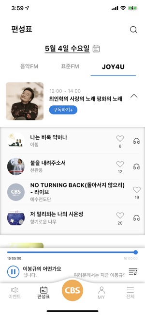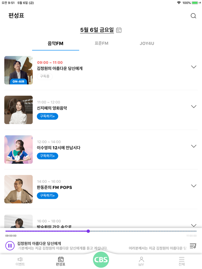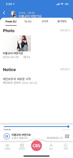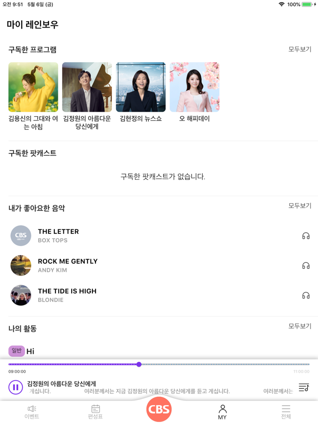 CBS레인보우스마트폰에서 만나는 CBS 라디오 App 레인보우-생방송 듣기 : CBS 음악 FM 93.9 & 시사 FM 98.1 & Joy4U-토크 : 사연 및 음악 신청하기-프로그램 : 라디오 편성표-포토 : 방송 진행자와 방송 현장 사진 보기-선곡표 : 방송되는 노래 제목 보기-설정 : 시작채널 설정 / 3G접속여부 설정 / 홈버튼 종료 설정 / 로그인 설정*라디오를 들으며 스마트폰의 다른 기능을 이용할 수 있는 멀티태스킹 기능이 지원됩니다*Wi-Fi 및 LTE, 3G 연결 지원 : LTE, 3G 접속시 데이터 요금이 발생합니다.*고객센터 Email : cbshelp@cbs.co.kr 고객센터 전화번호 : 02 - 2650 - 7000