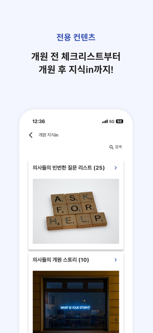 1) “나조차도 모르는 나만의 맞춤 동네를 찾아보자” **개원여기** - 개원하는 의사 분들이 많이 생각하는 15가지 고려 요소를 살펴보세요- 고려 요소 별로 중요도를 체크해주세요. 개원 준비하며 계속 바뀔 수 있으니, 편하게 현재 기준으로 입력하시면 됩니다- 현재 나한테 맞는 동네를 확인하고, 해당 동네들을 개원 입지 탐색의 시작점으로 삼으세요2) “좋은 매물에 대한 판단 기준을 설계하자” **추천매물**- 오픈닥터가 가입 이메일 혹은 카카오톡채널을 통해 추천 매물을 공유드려요- 추천 매물이 가진 장점에 대한 설명을 읽어보며, 좋은 매물의 조건을 이해하세요- 추천 진료과별 간단한 분석 내용을 읽어보며, 좋은 입지의 조건을 이해하세요3) “관심있는 동네의 나의 진료과별 기본적인 상권 정보를 파악하자” **입지분석**- 분석 데이터를 통해 해당 입지의 고객, 의원 등 각종 상권 통계 내용을 확인하세요- 의원 리스트를 통해 기존 병원들의 개원시기, 면적 등을 이해하세요- 관심 동네에 매물이 있다면, 매물 정보도 한번에 확인할 수 있습니다4) “상세한 입지 분석을 통해 동네를 명확하게 이해하자” **입지리포트**- 경영 전략 컨설팅 출신인 오픈닥터 데이터 분석팀이 제공하는 입지리포트를 만나보세요- 관심있는 행정동에 대한 진료과별 상세한 시장, 경쟁, 고객 분석을 제공해드립니다.- 행정동이 아닌, 특정한 위치 주변에 대한 분석이 필요하면 별도 분석 요청도 가능합니다5) “지속적으로 개원 트렌드와 매물을 팔로우하자” **오픈닥터레터**- 오픈닥터가 가입 이메일 혹은 카카오톡채널을 통해 오픈닥터레터를 공유드려요- 오픈닥터에서 많이 검색되는 동네, 개원가 뉴스를 통해 개원 트렌드를 이해하세요- 최근 오픈닥터에 추가된 매물들을 살펴보며 관심있는 매물은 탐방해보세요6) “오픈닥터와 함께 개원 성공을 위한 매력적인 매물을 찾아보자” **매물찾기**- 설문을 통해 원하시는 매물의 조건을 알려주세요. 오픈닥터 팀이 연락 드리고, 상담시간을 잡도록 하겠습니다- 상담을 통해 해당 입지