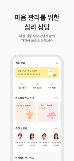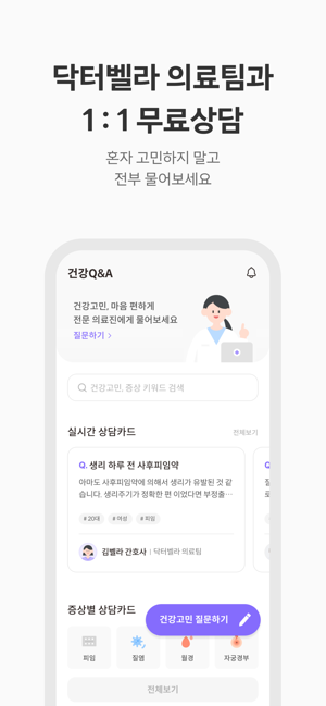 닥터벨라는 다양한 여성 질환에 대한 정보와 쉽게 털어놓기 힘든 고민을 털어놓을 수 있는 앱이에요.닥터벨라 의료팀과 1:1로 상담을 받을 수 있고, 같은 질환으로 고민하고 있는 여성들과 함께 정보를 나눌 수 있어요.검색해도 찾기 힘들었던 여성질환 정보들, 이제는 닥터벨라에서 확인해보세요.여러분의 일상에 도움이 되어드릴게요.● 닥터벨라 의료팀과 1:1 Q&A내 몸에 나타난 증상들, 혼자 고민하지 마세요.믿음직한 전문 의료진에게 무엇이든 물어보세요.여성질환, 유방건강 등 건강에 관한 궁금증들 모두 알려드릴게요.● 여성 전용 커뮤니티인증된 여성만 사용할 수 있는 커뮤니티에서 편안하게 얘기해요.자궁근종, 다낭성 난소 증후군, 월경, 임신 등 같은 관심사를 갖고 있는 여성들과 다양한 정보를 나누고 고민을 덜어내요. 우리 함께 건강한 삶으로 나아가요.●AI 생리 캘린더광고 없이 깔끔한 캘린더를 찾고 있다면 닥터벨라 AI 생리캘린더를 추천해요.원하는 부분만 골라 쉽게 기록할 수 있고, AI가 개개인에게 맞는 생리 주기를 예측해 줘요.내 몸에 나타나는 증상들, 생리 주기를 간편하게 기록해 보세요.●마음 관리를 위한 심리상담여성의 마음을 가장 잘 헤아릴 수 있는 상담사님들과 함께해요.이제는 마음 건강도 닥터벨라와 함께해 보세요.전화로 받는 익명・비대면 심리상담으로 편안하게 마음속 얘기를 꺼내보세요.● 건강 콘텐츠여성질환, 건강 관리 등 일상에 도움 되는 다양한 콘텐츠들이 준비되어 있어요.그동안 어렵게만 느껴졌던 건강 지식들, 닥터벨라에서 쉽게 알려드릴게요.다양한 건강 지식 함께 쌓아나가요.Partners of 닥터벨라- 대한유방갑상선외과의사회- 한국유방암환우연합회- 여성 콘텐츠 전문 기업 핑크리본- 문의 : 카카오톡 채널 - 닥터벨라- 제휴 및 제안 : support@motionlabs.kr