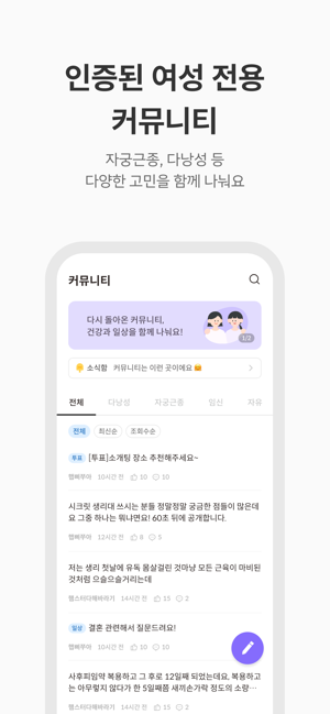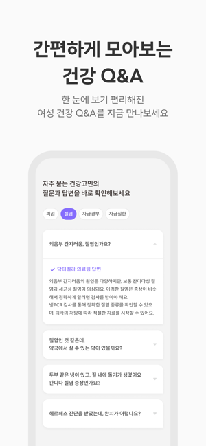 여성 건강 Q&A 서비스가 더욱 편리해졌어요!이제는 원하는 정보만 쉽고 빠르게 확인할 수 있어요.1. 자주 묻는 질문과 답변을 한 번에 확인할 수 있게 되었어요.피임, 부정출혈, 질염, 자궁질환 등 원하는 카테고리 질문들 쉽게 확인해 보세요.2. 필터링 기능을 통해 원하는 질문 리스트만 확인해요.원하는 주제에서 원하는 내용만 쏙쏙 빠르게 확인해 보세요.