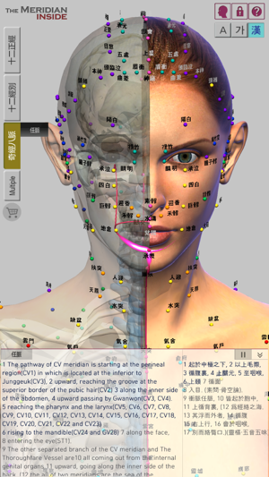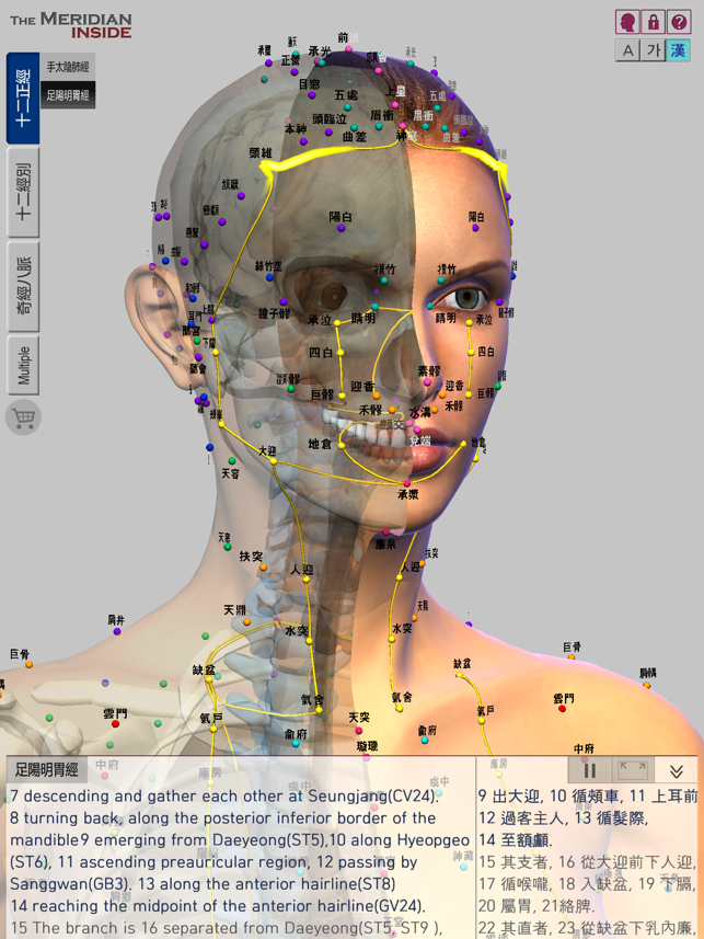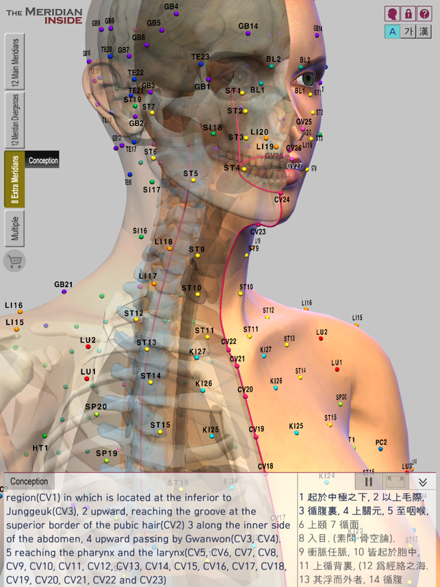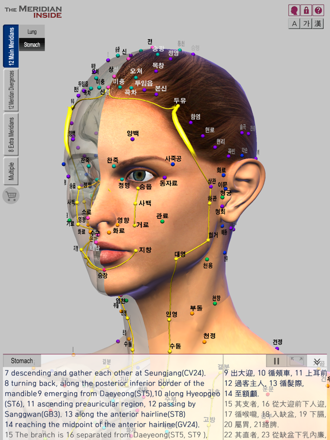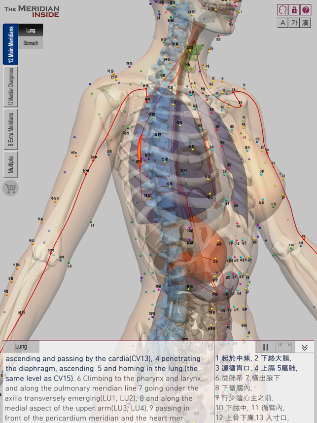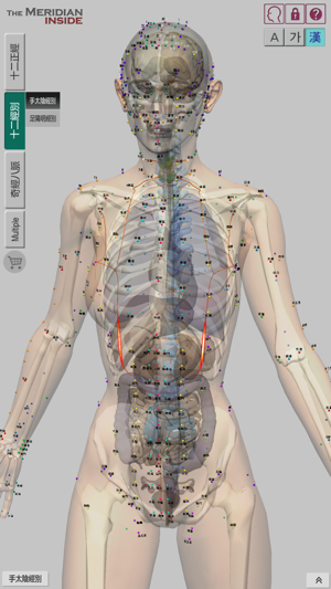 The Meridian Inside는 여러 한의사와 한의대 교수의 감수를 거쳐 정확함과 편리함을 자랑하며 각각의 경락과 인체내의 장기가 풍부하고 선명한 색으로 표현되어 있어서 실제 침시술시, 환자 설명시, 한의학을 공부할 때 최고의 서포트를 얻을 수 있습니다.The Meridian Inside는 인체의 32개 정경인 12정경과 12경별, 기경팔맥을 인체내의 장기, 뼈와 함께 한화면에서 입체적으로 파악할 수 있는 앱입니다.기존의 책들에서는 평면적 이미지로만 경락, 경혈이 표현되어 있어서 실질적으로 파악하기 어려웠던 경락유쥬의 복잡한 흐름을 다각도의 방향에서 정확하게 알아낼 수 있습니다.The Meridian Inside는 강 경락의 흐름을 알고자 할때 반드시 확인해야 하는 자료를 참고문헌 원서의 원문 그대로 한자로 제공하며, 한글과 영어로 번역하여 알기쉽게 보여드립니다.기본화면에서는 하단부 일부 공간에 콘텐츠를 보여주고 있지만 필요에 따라 내용을 감추거나 화면에서 크게 확장하여 볼 수 있습니다.The Meridian Inside는 한 화면에서 다수의 경락을 선택하여 여러 경락의 흐름을 서로 비교해서 볼 수 있습니다.피부위 흐름과 장기내 흐름, 정경과 경별, 기경팔맥 등을 동시에 보이게 하거나 감추어서 경락유주의 연관성을 연구하는데 큰 도움을 줍니다.The Meridian Inside의 콘텐츠와 경락유주의 정확도는 검증된 자료와 연구진에 의해 탄생되었습니다.WHO,"황제내경 영추", "대학 경락경혈학 총론", "동의보감" 의 내용을 기반으로 만들어졌습니다.www.verderoot.com