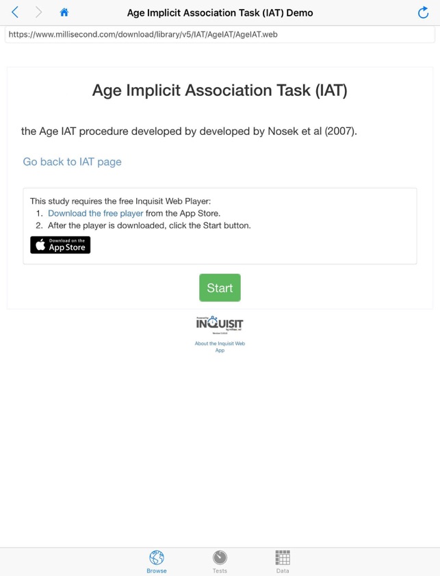 Conduct or participate in psychological research - on your iPhone or iPad. The Inquisit Player enables research participants to find psychological research studies and participate in them. It also enables researchers to administer psychological tests on iPhones and iPads in the lab, clinic, or in the field, in both online or offline modes. Inquisit is a leading tool among psychological and behavioral researchers for computer-based measurement of a wide variety of psychological processes and functions. Inquisit supports over 100 well known psychological tests, including the IAT, Stroop, Wisconsin Card Sort, Iowa Gambling Task, N-Back, Digit Span, Dot Probe, Flanker Task, Balloon Analogue Risk Task (BART), Simon Task, Mental Rotation, Paced Auditory Serial Addition Test (PASAT), Go/No-Go, Simple Reaction Time, Stop Signal Task, Sternberg Memory Task, Trail Making Test, Tower of London, and dozens of others. Administer the tests as is, customize them, or program your own.