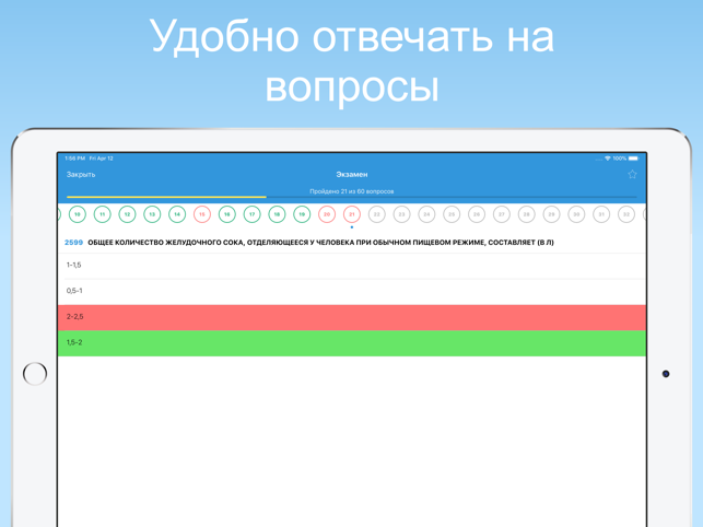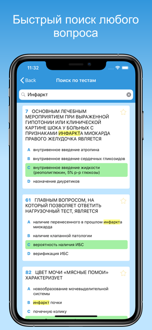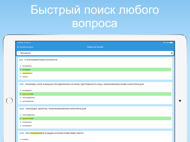 Функции приложения:- возможность учить вопросы по блокам, а главное сохранять пройденный результат!- возможность добавлять плохо запоминающиеся вопросы в избранное и прорешивать только их- возможность проходить работу над ошибками на всех этапах тестирования - возможность вернутся к ранее отвеченным вопросамПриложение МедикТест создано для подготовки всех медицинских кадров, нуждающихся в прохождении аккредитации (Студентов медицинских ВУЗов, ординаторов, учащихся средних специальностей)В приложении представлены следующие направления:Первичная аккредитация (специалитет) 2023• Педиатрия• Лечебное дело• Стоматология• Фармация• Медико-профилактическое дело• Медицинская биохимия• Медицинская кибернетика• Медицинская биофизикаПервичная специализированная аккредитация (ординатура)• Авиационная и космическая медицина• Акушерство и гинекология• Анестезиология-реаниматология• Бактериология• Гастроэнтерология• Гематология• Гигиена труда• Дерматовенерология• Детская кардиология• Детская урология-
