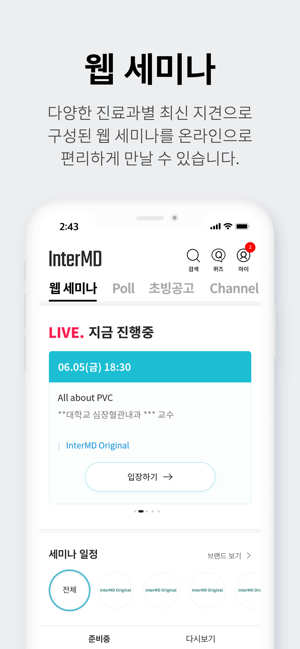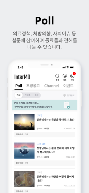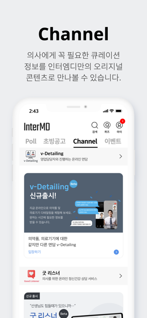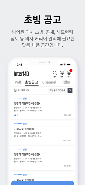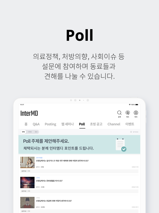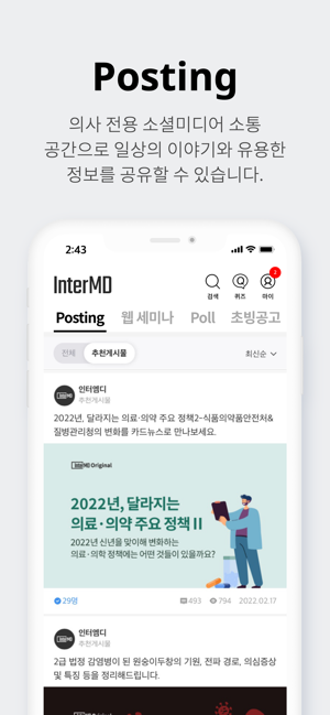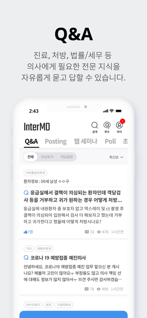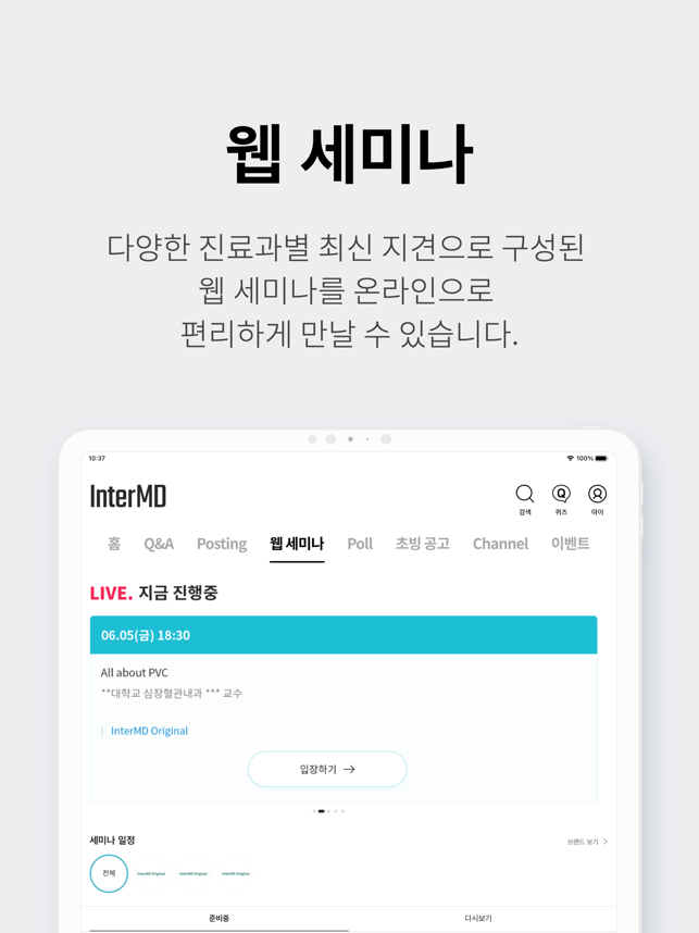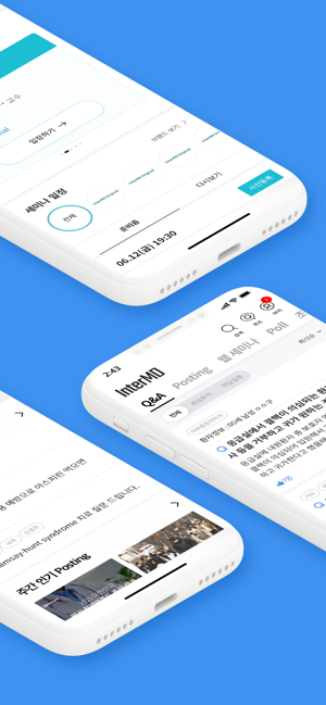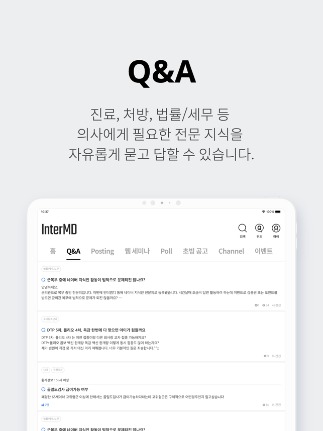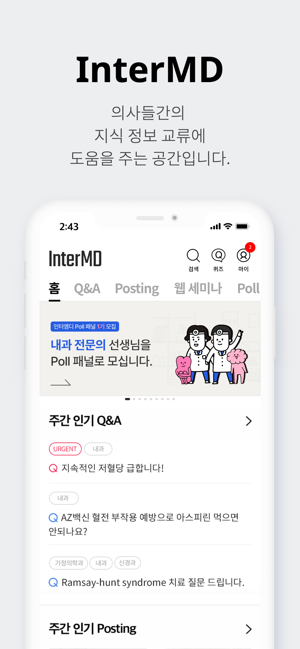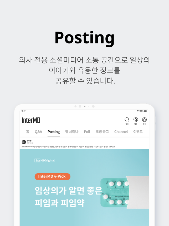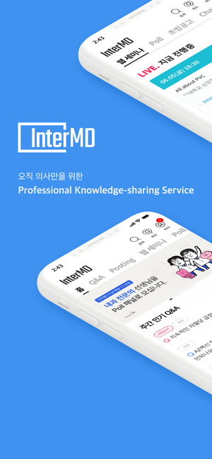 [서비스 소개]오직 의사만을 위한 Professional Knowledge-sharing Service인터엠디(InterMD)는 의사들 간의 지식·정보 교류에 도움을 주는 공간입니다.온라인 상 실시간 협진이 가능하며, Professional 로서 의사가 필요로 하는 다양한 지식과 정보를 공유할 수 있습니다.[주요 기능]◆ Q&A | 전문적인 지식·정보를 자유롭게 묻고 답하는 서비스과목별, 분야별 진단과 처방은 물론 법률 세무 등 의사로서 마주할 수 있는 다양한 주제에 대해 동료 의사 및 전문가들과 자유롭게 묻고 답할 수 있습니다.검색과 개인화 기능에 따른 맞춤형 정보를 제공합니다.◆ Posting | 정보와 일상을 나누고 공감하는 의사 전용 소셜미디어일상의 이야기와 유용한 정보를 나누고 공유하는 의사 전용 소셜미디어입니다.소소한 일상부터 경제, 정치 등의 다양한 이슈까지 동료 의사들과 자유롭게 소통할 수 있습니다.◆ 웹 세미나 | 온라인에서 편리하게 만나는 의료 최신지견다양한 진료과 별 의료 최신지견으로 구성된 웹 세미나를 온라인으로 만날 수 있습니다.모바일과 PC를 통해 공간의 제약 없이 편리하게 시청할 수 있으며 실시간으로 연자와의 질의 응답이 가능합니다.◆ Poll | 다양한 주제에 대해 서로의 견해를 나누는 설문조사의료 관련 정책이나 정보, 약물 처방 의향, 사회 이슈 등 의사에게 이슈가 되는 다양한 주제의 심도 깊은 설문에 참여하고 동료 의사들의 견해와 생각을 확인할 수 있습니다.◆ 초빙 공고 | 오직 의사만을 위한 맞춤 채용 공간의사들의 커리어 관리에 도움을 드리는 의사만을 위한 맞춤 채용 공간입니다.병의원 의사 초빙, 상급병원 공채, 헤드헌팅 정보 등 다양한 초빙공고를 무료로 만나볼 수 있으며 초빙유형, 근무지역 등에 따른 맞춤형 조건 설정이 가능합니다.◆ Channel | 의사로서 꼭 확인해야 하는 큐레이션 콘텐츠학회의 온라인 학술대회 및 의사들에게 꼭 필요한 큐레이션 정보들이 다양하게 제공됩니다.약물 관련 정보는 물론 Issue와 Tre