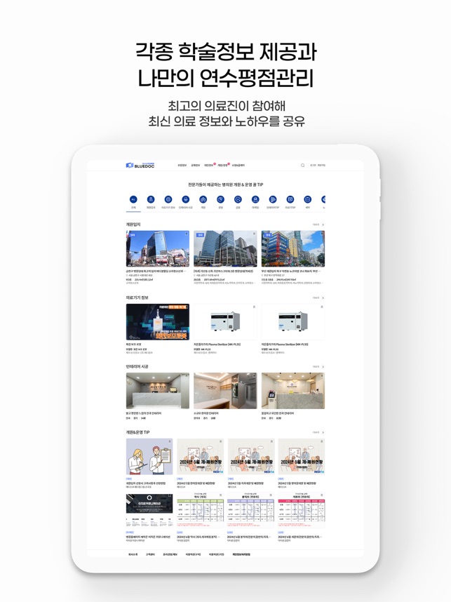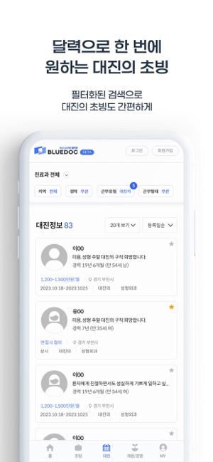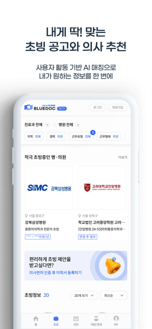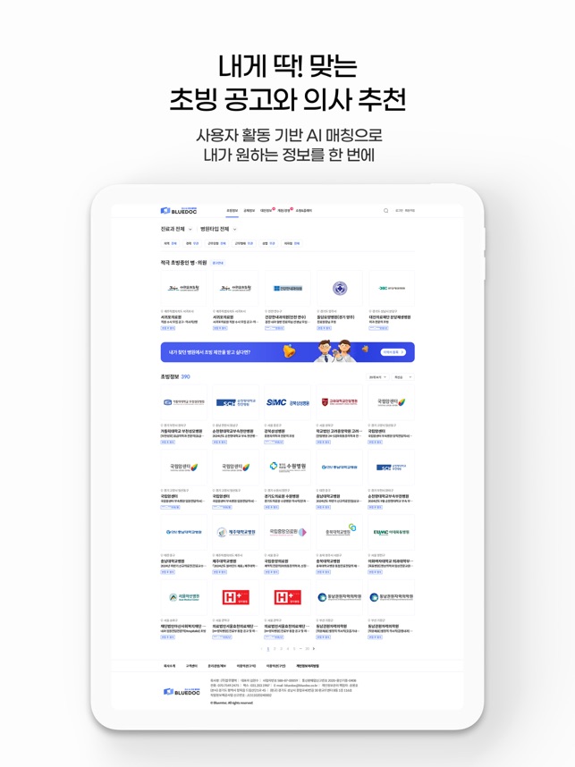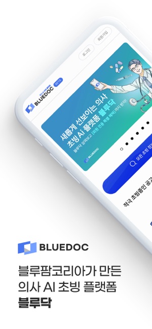 의사와 병원을 위한 Ai 초빙 플랫폼 블루닥은 의사가 원하는 근무조건과 활동을 기반으로 하여 AI 맞춤 초빙 정보를 제안합니다. 초빙, 대진, 그리고 공채까지 다양한 병원의 공고에 지원하고 블루닥과 함께 성공적인 취업하세요!개원을 준비하는 원장님을 위한 개원, 경영에 관한 유용한 팁을 놓치지 마세요! 더불어 다양한 혜택으로 포인트도 쌓고 쇼핑도 즐길 수 있습니다. 지금 바로 Bluedoc을 시작해보세요#2023 KOSDAQ 코스닥 상장 기업#2023 중소벤처기업부 예비유니콘 최종 선정#2022 중소기업기술혁신대전 장관 표창 수상#2021 중소기업기술혁신개발사업 기업 선정#2021 아기유니콘 200 육성사업 기업 선정▶ 내게 딱! 맞는 초빙 공고&의사 추천 Ai 매칭 - 사용자 활동 기반 Ai 매칭으로 내가 원하는 정보를 한 번에!▶ 놓치지 마세요! 한 눈에 보는 공채달력 - 공채 일정 빠르게 확인하고 성공적인 취업준비▶ 검색 한 번으로 원하는 대진의 초빙 - 필터화된 검색으로 대진의 초빙도 간편하게▶ 경영 꿀팁&개원 준비도 블루닥에서 - 병원 성공 여부를 결정하는 개원 입지부터 경영에 유용한 정보까지▶ 다양한 주제의 웹심포지움, 블루닥 아카데미 - 최고의 의료진이 참여해 최신 의료 정보와 노하우를 공유▶ 클릭만으로 포인트 쌓고 쇼핑까지, 쇼핑&플레이 - 수 많은 프로모션과 다양한 혜택 제공서비스 이용 중 불편사항 문의주세요.이메일 : help@bluedoc.co.kr고객센터 : 070-7549-2475■ 블루닥 앱에서 사용하는 접근권한 안내[필수적 접근권한]필수적 접근권한 없음[선택적 접근권한]▷ 사진 : 회원인증 및 서비스 이용을 위한 필요한 사진 및 파일 등록 기능▷ 카메라 : 회원가입 및 서비스 이용을 위한 필요한 사진 및 파일 등록 기능▷ 알림 : 앱 Push 알림※ 선택적 접근 권한은 해당 기능 사용 시 요청하며, 동의하지 않아도 서비스 이용 가능※ 휴대폰 설정 > 애플리케이션(앱) > 블루닥
