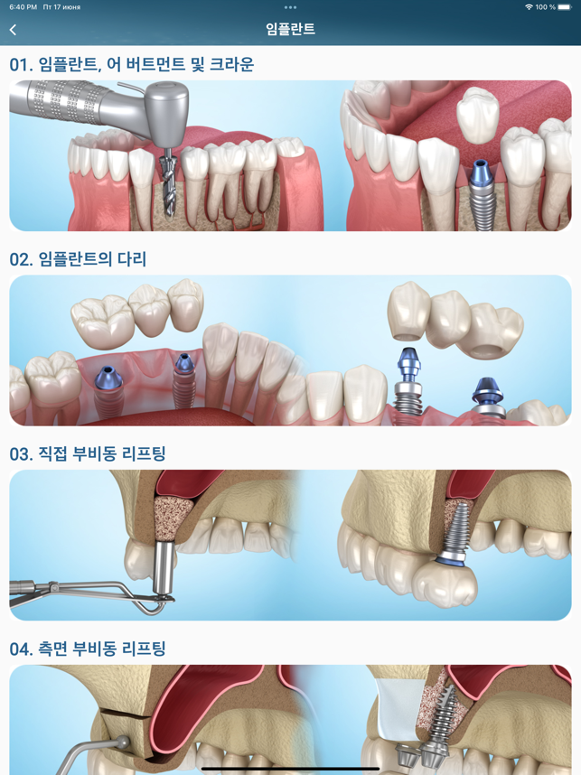 Illustrated Dentistry - 치과 의사가 치과 앱으로 환자를 교육하도록 돕습니다.이 앱은 보다 효과적으로 환자와 상담을 원하는 전문 치과의사들을 위해 만들어졌습니다. 대규모 3D 치과 치료용 이미지 컬렉션이 이 앱내에서 그룹별로 분류되어있습니다.빠르고 편리합니다. 많은 치과의사들이 환자에게 치료 과정을 설명 할 때마다 종이에 그림을 그리는데 시간이 좀 걸릴 수 있습니다. 앱 데이터베이스에서 필요한 그림을 찾는 것은 매우 쉽습니다. 약 10 초가 소요됩니다.3D 이미지는 사진보다 낫습니다. 환자는 혈액 수술 사진이나 실제 치아 사진을 보고 충격을 받아 두려워 할 수 있습니다. 3D 이미지를 사용하면 환자는 거의 항상 그러한 정보를 차분하게 인식합니다.품질과 정확성. 모든 이미지는 정확한 해부학, 실제 절차, 치료에 기반을 두고 전문 의사와 치과 의사의 지원을 받습니다.어디에 있어도 필요한 이미지를 즉시 볼 수 있습니다. 이 앱은 이미지를 다운로드하기 위해 인터넷을 사용하지 않습니다.필요한 모든 3D 이미지 파일이 이미 앱 내부에 포함되어 있습니다. 추천 이미지 테마 카테고리를 사용하면 가장 많이 사용하는 테마에 더욱 빠르게 액세스 할 수 있습니다. 그러기 위해서 원하는 주제를 즐겨찾기에 넣어야합니다.카테고리별 주제 목록:• 치아와 턱의 해부학. 정보 설명도.• 위생 및 치아 미백. 치석 및 플라크.구강 청소• 치료-치과 치료. 다양한 유형의 충치.• 가공의치.베니어판,관교의치,금니,이동식 의치• 임플란트.팽창. 치아의 부분적 또는 완전한 복원.• 치과 교정학. 교정기,흡장, 선천성 및 후천성 결함.• 치주학. 다양한 잇몸 문제와 치료.• 수술. 제거, 반측 절단, 상악동골인식,팽창 갤러리는 slideshow 프레젠테이션 원칙에 따라 작동합니다. 관심있는 테마를 열면 테마 자체에 3-10 개의 이미지가 포함되어 있습니다. 가장 적합한 그림을 선택해서 환자에게 보여주고 조언합니다. 그런 다음 상담을 계속하면서이 테마에서 인접한 이미