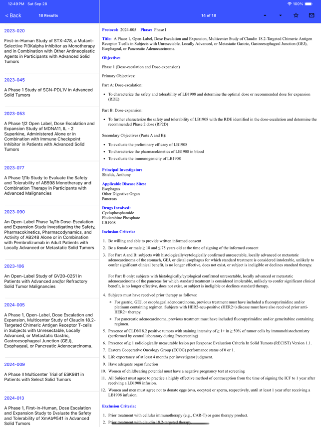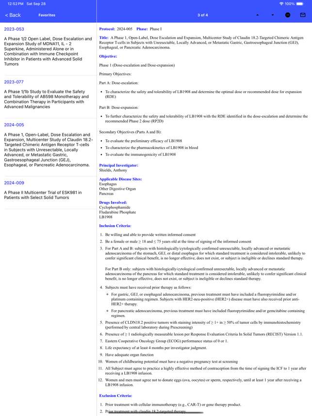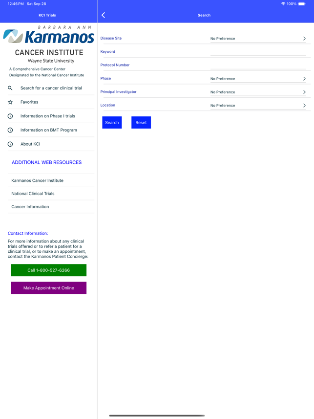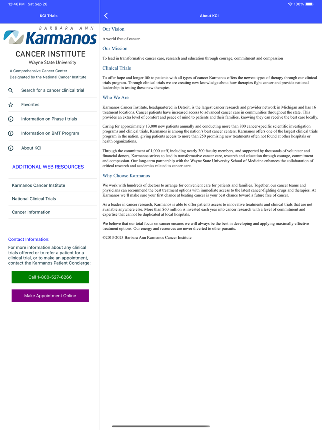 The Barbara Ann Karmanos Cancer Institute, located in mid-town Detroit, Michigan, is providing a free app for the iPhone and iPad which provides detailed information on the open interventional cancer clinical trials. App Features:• Search for cancer trials open at Karmanos Cancer Institute by disease site, keyword, protocol number, phase, principal investigator, or location.• Protocol information displayed includes: title, objectives, principal investigator, disease sites, investigational agents involved, inclusion criteria, exclusion criteria• Save clinical trials to Favorites for quick retrieval later• Ability to email a contact the details of a clinical trial• Buttons to call and email Karmanos Cancer Institute directly • Information about Phase I and BMT studies offered at Karmanos Cancer Institute• Links to other National Cancer Institute resources regarding cancer