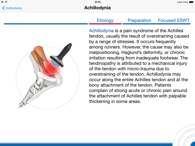 For users of Extracorporal Shockwave Therapy machines, this app provides detailed treatment instructions (focussed ESWT) for 10 common conditions, plus energy data, contraindications and the ability to keep energy level data and treatment notes for your most common conditions.Conditions covered are Achillodynia, Calcific tendonitis, Golfers Elbow, Patellar tendonitis, plantar fasciitis, pseudoarthrosis, tennis elbow, tibial stress syndrome, trigger points and trochanteric tendonitis. General guidelines and contraindications are also covered. This app features a 3D view of the body, plus individual treatment guidelines with clear images for PiezoWave ESWT treatments. A great way to educate patients and support this powerful therapy!