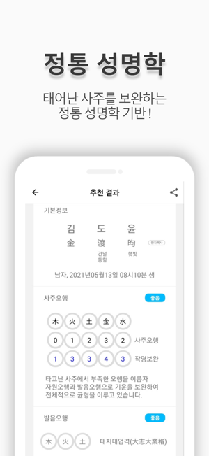 우리 아이에게 예쁜 이름을 선물해 주고 싶으신가요?아이 이름 작명은 그 아이의 인생에서 가장 중요한 부분 중 하나입니다. 작명 이름은 그 아이의 존재를 대표하며 정체성을 형성하는 중요한 요소입니다. 그러므로 아이의 이름 작명은 신중하고 의미 있는 과정이 되어야 합니다.대한민국 1등 작명 어플 네이머가 여러분을 도와드릴 준비가 되어 있습니다. 네이머는 과거부터 현재까지의 다양한 성명학 이론들을 체계적으로 분석하여 가장 보편적으로 통용되는 정통 성명학을 기반으로 제작되었습니다.정통성명학에 인공지능 기술을 접목하여 쉽고 빠르게 작명합니다.[태어난 사주를 보완하는 정통성명학 기반 작명]네이머는 아이의 이름을 정하실 때 태어난 사주를 체계적으로 분석하는 것을 도와줍니다.각 아이는 태어난 시간, 날짜, 그리고 장소에 따라 고유한 사주를 가지고 있습니다.이 사주를 토대로 네이머는 부족한 에너지나 성격 요소를 보완하는 이름을 제안합니다.부모님들은 종종 사주 분석을 통해 아이의 개성과 특징을 파악하려고 합니다.네이머는 이러한 요구에 부응하기 위해 태어난 사주를 가장 효과적으로 활용하여 이름을 추천합니다.이를 통해 아이의 개성과 미래에 대한 긍정적인 영향을 가져올 수 있습니다.[인공지능 기술과 성명학의 조화]네이머는 성명학의 전통적인 이론과 현대 기술을 조화시킵니다.이 어플은 머신 러닝과 자연어 처리 기술을 활용하여 대용량 데이터를 분석하고 가장 효과적인 이름을 추천합니다.이것은 정통 성명학의 원칙을 기반으로 하면서도 보다 신속하고 정확한 작명을 가능하게 합니다.네이머를 통해 부모님들은 아이의 이름을 선택하는 과정을 더욱 간편하고 효과적으로 진행할 수 있습니다.이 어플은 이름 작명에 대한 전문적인 지식이나 이해가 없더라도 부모님들이 자신만의 방식으로 아이의 이름을 선택할 수 있도록 도와줍니다.[편리한 공유 기능]네이머는 작명 결과를 가족과 지인들과 쉽게 공유할 수 있는 편리한 기능을 제공합니다.추천된 이름을 SNS나 메시지로 공유하면 가족과 지인들의 의견을 수렴하고 함께 고민할