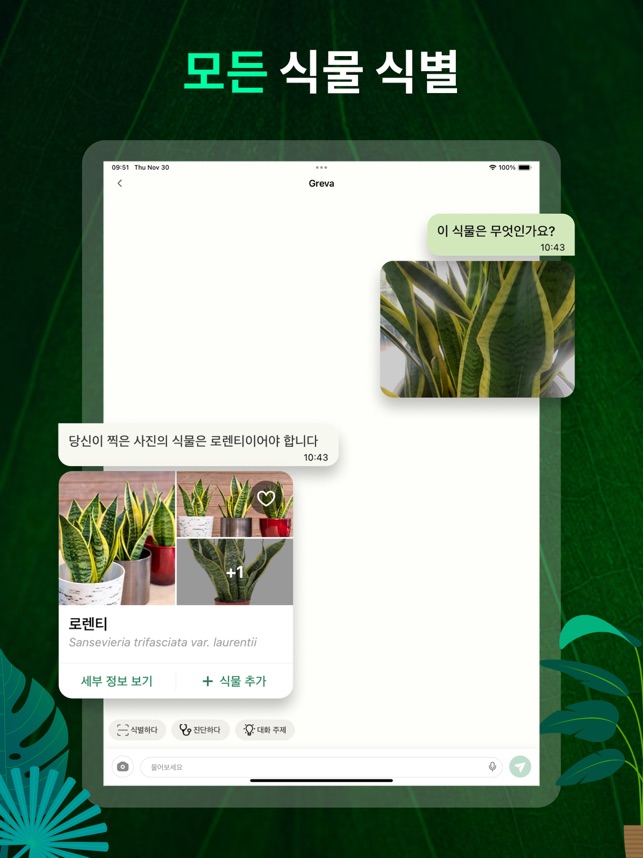 PlantAI는 최첨단 기술을 활용한 최신 AI 식물 관리 도우미입니다. 이 앱을 사용하면 식물과 관련된 질문에 대한 답변을 직접 얻을 수 있지만 용도는 이에 국한되지 않습니다. 알려지지 않은 식물종을 식별하고, 식물을 진단하고, 전문적인 식물 관리 가이드를 받을 수 있습니다.PlantAI를 사용하면 언제 어디서나 몇 초 안에 식물에 대한 호기심을 충족시킬 수 있습니다. 식물의 이름, 특성, 독성 등 자세한 식물 정보를 얻을 수 있습니다. 또한 이 앱은 물, 비료, 분무, 청소, 보고 등 직접 심고 키우는 팁을 제공합니다.지금 가장 인기 있는 AI 식물 챗봇을 사용해 더 넓은 식물 세계를 탐험해 보세요!주요 특징들:플랜트 관련 질문에 대한 즉각적인 답변을 얻으세요높은 정확도로 식물 식별식물 건강 문제를 자동 진단하고 그에 맞는 솔루션을 얻습니다.푸르른 식물이 더 잘 자랄 수 있도록 전문가 수준의 식물 관리 팁대화에 좋아요를 눌러주세요프리미엄 정보-구독명 : 연간 프리미엄-구독 기간: 1년(7일 평가판)-구독 설명: 사용자는 무제한 메시지, 식물 식별 및 식물 진단이 포함된 1년 프리미엄을 받게 됩니다.• 구매 확인 시 iTunes 계정으로 요금이 청구됩니다.• 현재 기간이 종료되기 최소 24시간 전에 자동 갱신을 끄지 않으면 구독이 자동으로 갱신됩니다.• 현재 기간이 종료되기 24시간 이내에 계정에 갱신 비용이 청구되며, 갱신 비용을 확인합니다.• 무료 평가판 기간 중 사용하지 않은 부분은 제공되는 경우 사용자가 해당 간행물에 대한 구독을 구매할 때 소멸됩니다(해당하는 경우).• 구독은 사용자가 관리할 수 있으며 구매 후 사용자의 계정 설정으로 이동하여 자동 갱신을 끌 수 있습니다.이용약관: https://app-service.askmybotanist.com/static/user_agreement.html개인 정보 보호 정책: https://app-service.askmybotanist.com/static/privacy_policy.html문의: mailto: