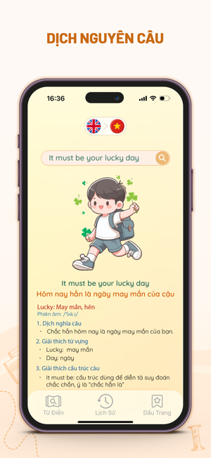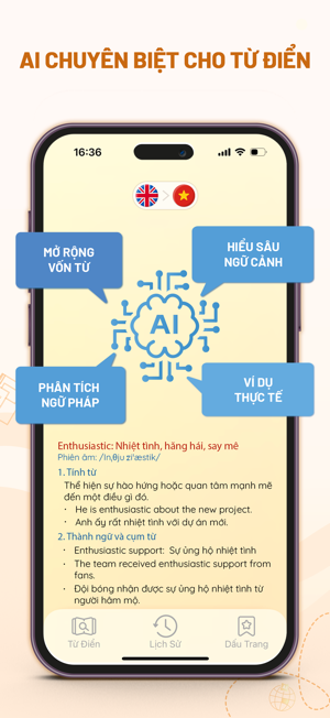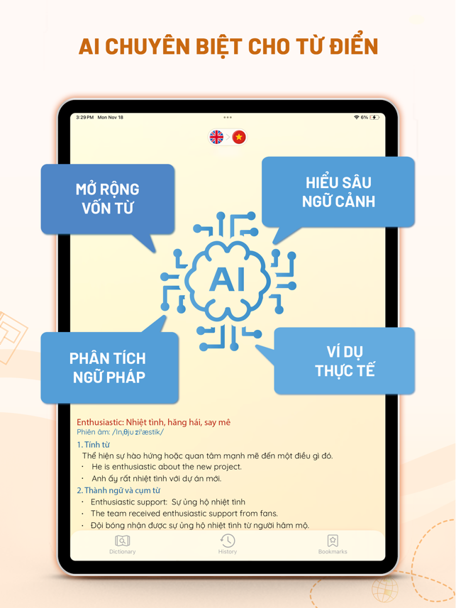 Từ Điển Anh-Việt AIĐược hỗ trợ bởi công nghệ AI luyện riêng cho việc làm từ điển, ứng dụng Từ Điển Anh-Việt mang đến trải nghiệm tra cứu từ vựng hoàn hảo. Với vốn từ không giới hạn, bạn có thể tìm thấy định nghĩa cho bất kỳ từ nào tồn tại, từ đơn giản đến phức tạp nhất.**Tính năng nổi bật:**- AI chuyên biệt: Ứng dụng sử dụng AI được đào tạo riêng cho mục đích từ điển, mang lại độ chính xác và hiệu quả vượt trội.- Vốn từ không giới hạn:Đưa ra định nghĩa cho mọi từ mà bạn tìm kiếm, không còn lo lắng về việc thiếu từ.- Chia động từ và danh từ: Phân tích và cung cấp các dạng của động từ, danh từ kèm theo ví dụ cụ thể cho từng dạng.- Dịch và phân tích câu: Dịch nguyên câu và phân tích ngữ pháp chi tiết, giúp bạn hiểu sâu hơn về cách sử dụng từ trong ngữ cảnh thực tế.Từ Điển Anh-Việt AI là người bạn đồng hành lý tưởng cho việc học tiếng Anh, hỗ trợ bạn mỗi ngày trong việc phát triển vốn từ và ngữ pháp. Tải ngay để trải nghiệm sức mạnh của AI trong việc học ngôn ngữ!