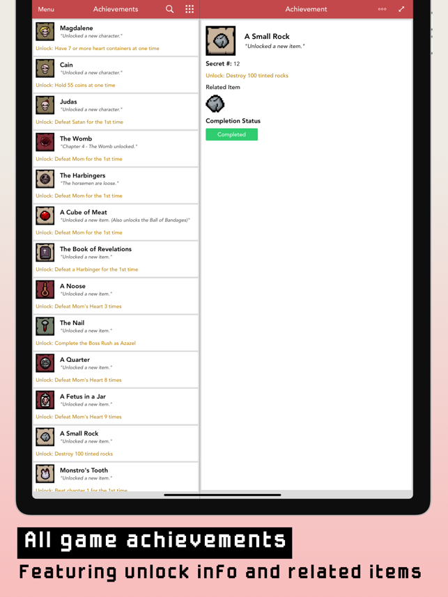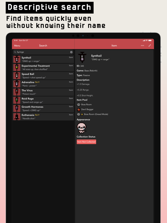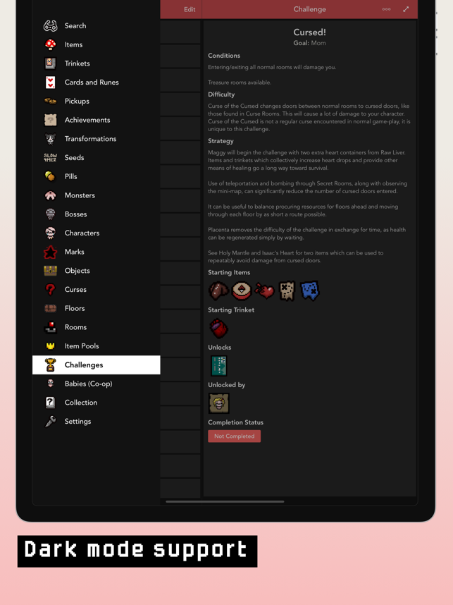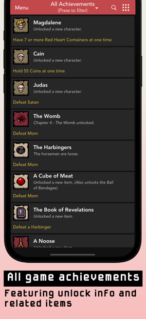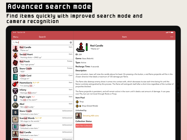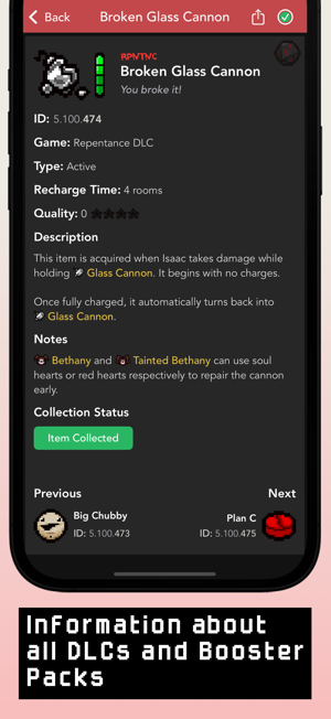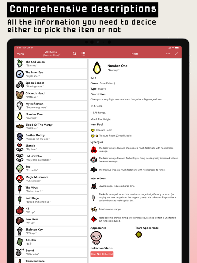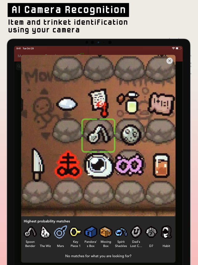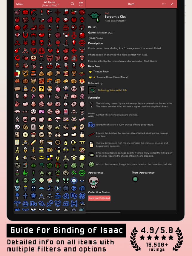 The only guide you need for Binding of Isaac Rebirth & DLCs (incl. Repentance), featuring advanced search, collections, steam sync, and item recognition using the cameraQuickly find all the information you need about the game Binding of Isaac: Rebirth and all DLCs: Afterbirth, Afterbirth+, Repentance, Repentance+ and also Antibirth mod.Have trouble identifying an item? - Use your device's camera to quickly identify an item- Advanced search featuring aspect tag search (example: "green mushroom")- Color sorting and advance filters by game, type, collection status, and pool* This guide shows you comprehensive information about:- Items (with synergies and interactions)- Trinkets- Bag of Crafting (added in Repentance DLC)- Cards and Runes- Pickups- Achievements- Transformations- Seeds- Pills- Marks- Monsters- Characters- Bosses- Objects- Curses- Floors- Rooms- Item Pools- Challenges- Babies (Co-op)- Collection (featuring Steam Sync for Achievements)*Global search with desc