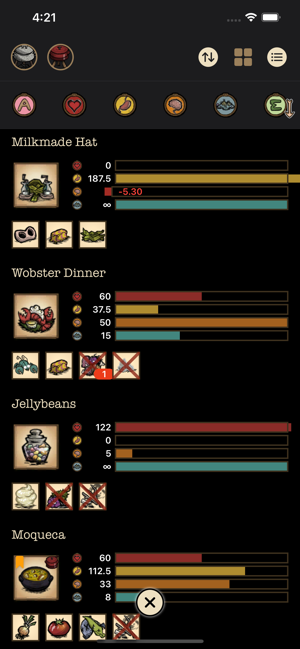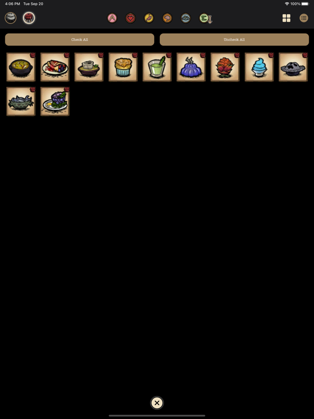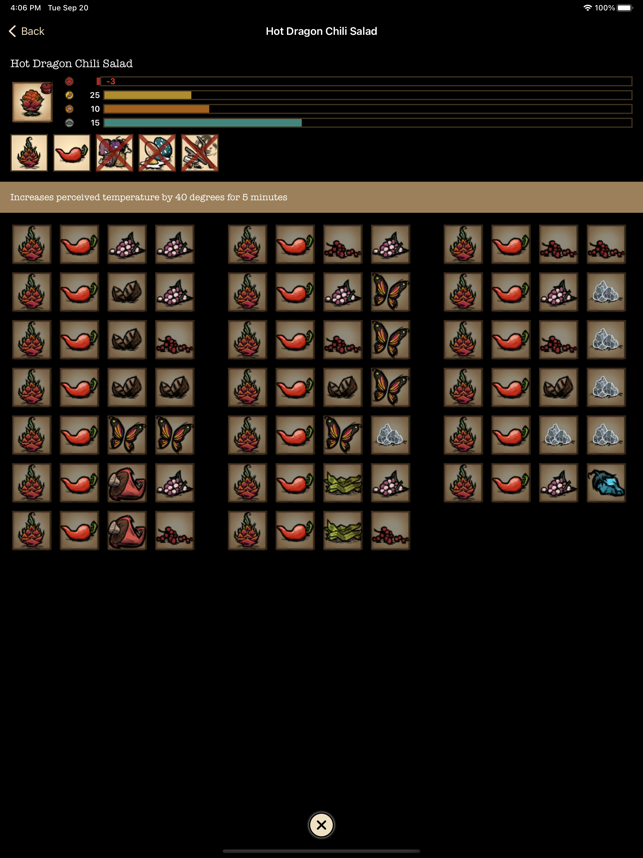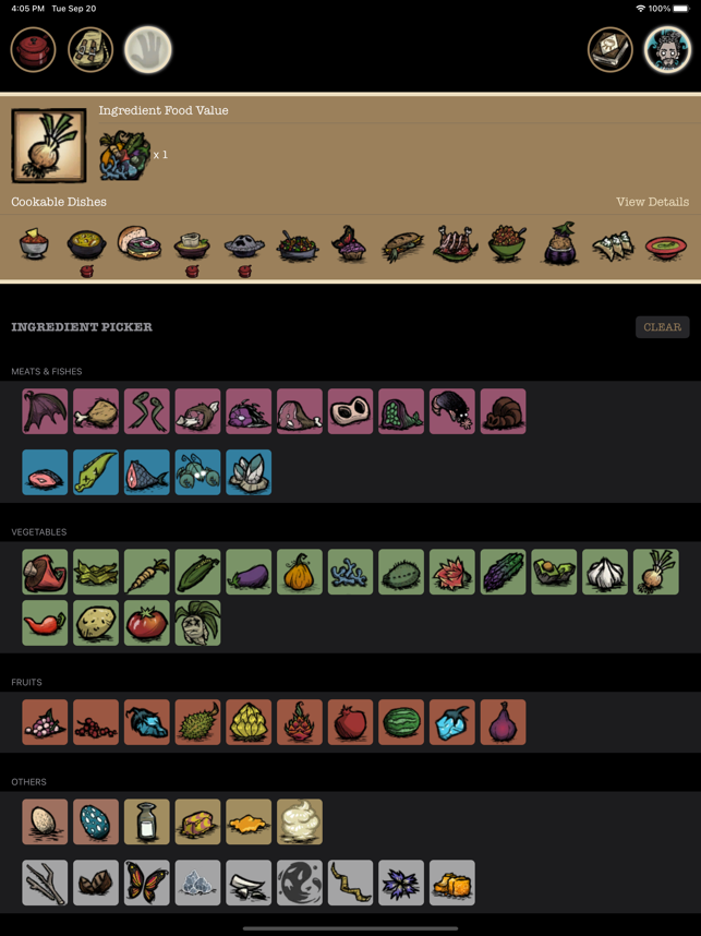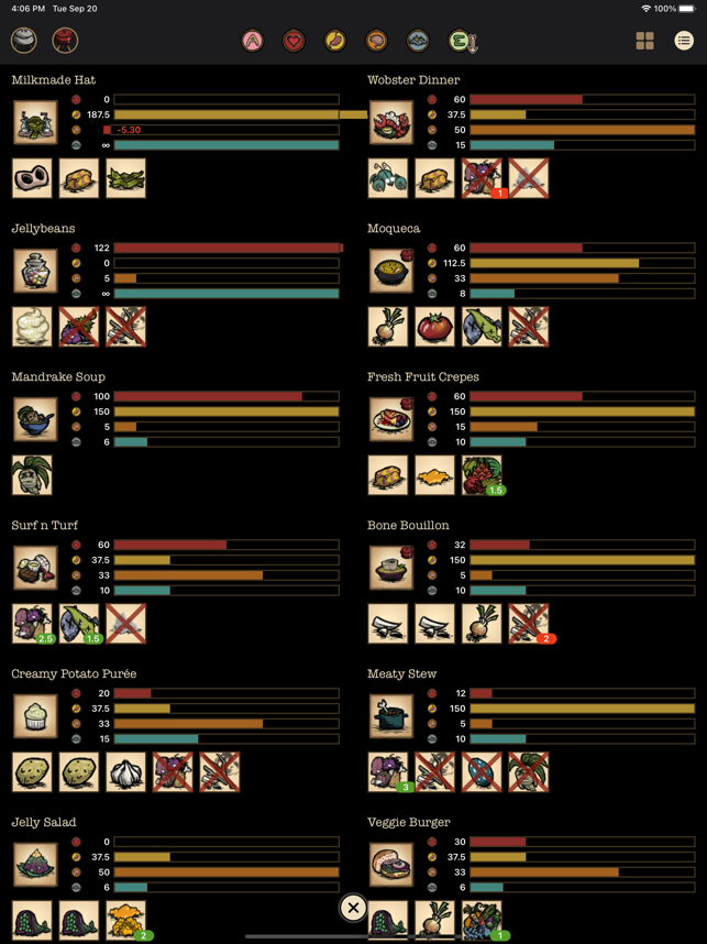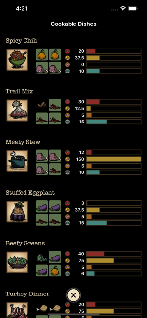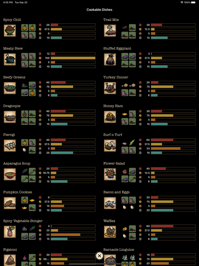 Complete cooking guide for Don't Starve Together, includes Warly's recipes:- Crockpot (& portable crockpot) simulator- Calculate what you can cook with current inventory- Calculate what you can cook with single Ingredient- Recipes list sorted by custom attribute