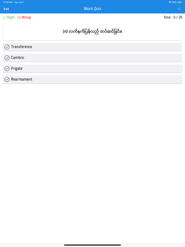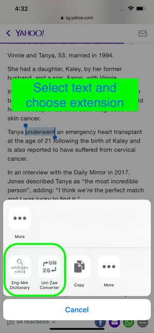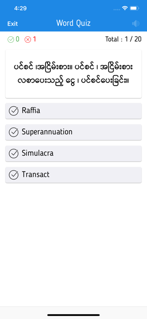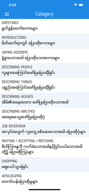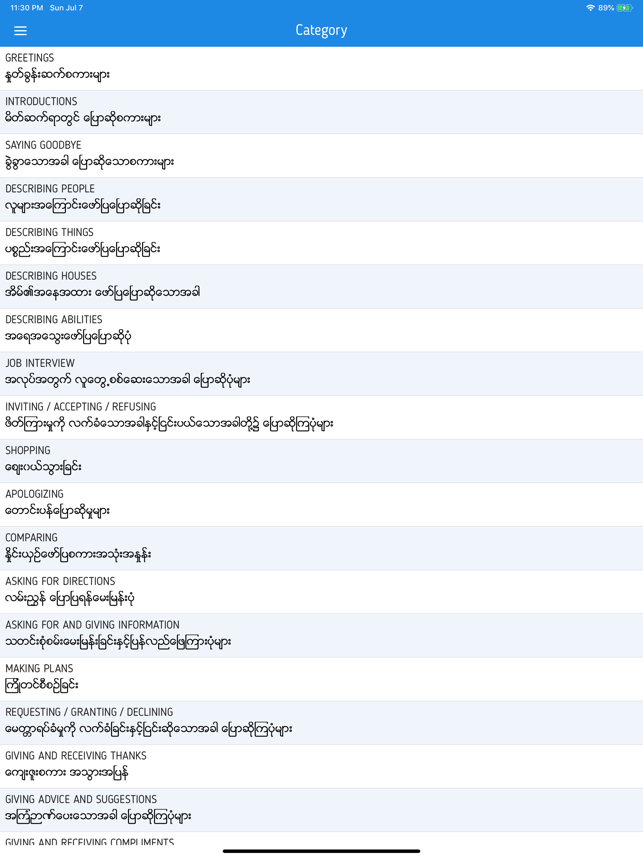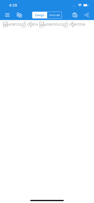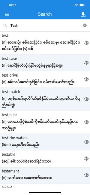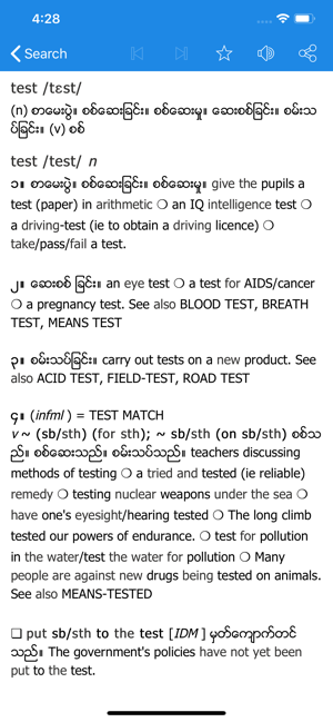 English MM Dictionary is a offline English to Myanmar or Myanmar to English Dictionary.Main Features : - Work without internet access- Auto suggest searching word- Voice settings- Easy navigation- Synchronise with server and get new meaning of words- Check updates automatically- Provided 40 chapters in learning module- Play word quiz- Provided example sentences, phonetic, synonym and antonym words- Font converter (Myanmar Unicode to Zawgyi and vice versa)# Unicode to Zawgyi Share Extension>>> If your device doesn't display myanmar font properly, you can use this extension to convert.# Dictionary Share Extension >>> You can search definition by select and share to this extension while using other app.
