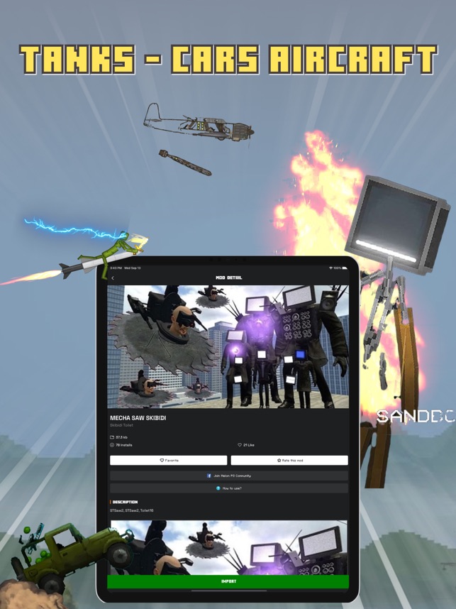 Mod for MelonMod for Melon provides users with many opportunities to create different situations and characters. Become part of a great experience that can involve car crashes, tanks, guns, dinosaurs, or tall buildings with tons of furniture.All mods are thoroughly tested and optimized for mobile devices. Simply browse the mods you like and click "Download". We've also provided detailed instructions on installing the mod loader into the game, so every player can install mods easily, quickly, and without any issues.Why you should download Mod for Melon:- A selection of unique and rare hand-picked mods.- A user-friendly and intuitive interface.- Mods are organized into different categories for convenience.- Each mod features a brief description and images.- Play with your friends using our mods.Features:- Automatic installation of addon in one touch- Hundreds of different items & mods for Melon- Constant updating of databases- Friendly and convenient user interface- An