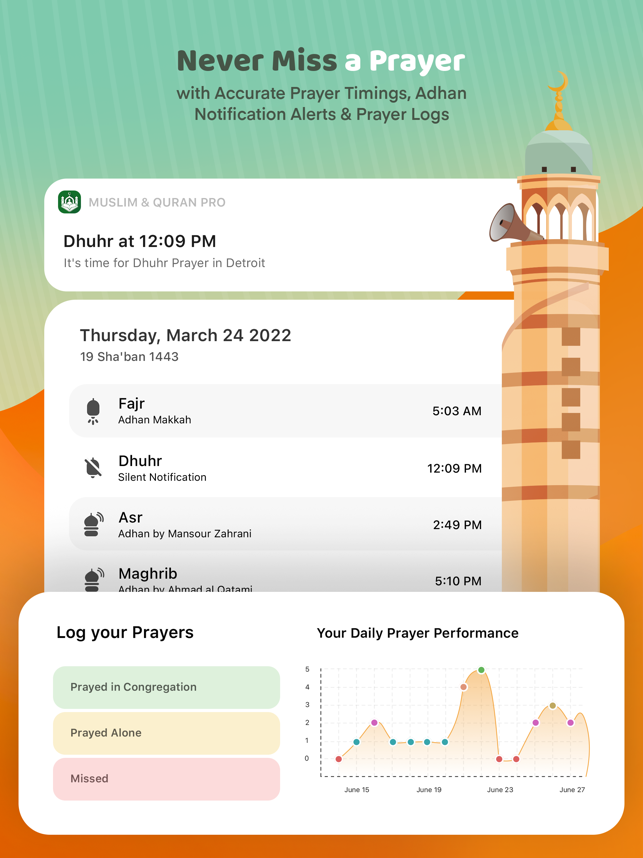 Muslim & Quran app has been developed with one single-minded goal, to help you become a better Muslim! It's the most advanced and comprehensive Islamic mobile application that is geared towards providing all the requisite Islamic information and knowledge as and when required. Get accurate prayer timings along with Adhan notification alerts. Maintain your personal prayer record. Read the Holy Quran with translation, tafseer & audio recitation. Explore Hadith books, or Duas & Azkar from Hisnul Muslim. View accurate Ramadan times & track your fasting progress. Calculate your due Zakat. Find Qibla direction, or discover mosques, halal restaurants & other Islamic places in your vicinity. View Hijri calendar & track Islamic events. View Live Mecca & Medina channels, or listen to daily Haramain Salah recordings. Plus many more features!KEY FEATURES• Accurate Prayer Timings calculated for your exact geographical location.• Prayer notifications with several beau