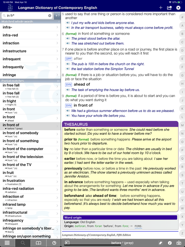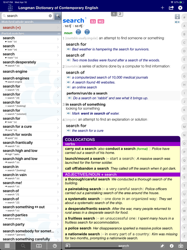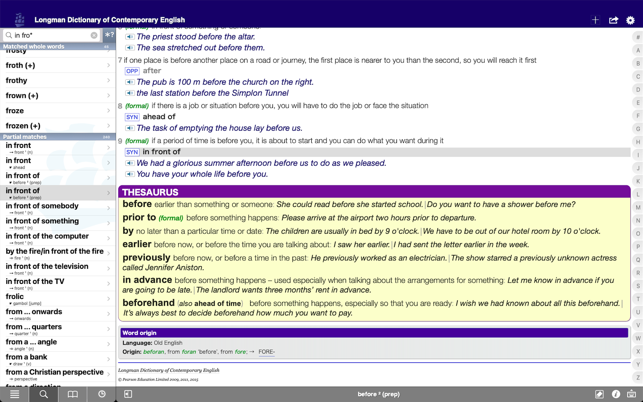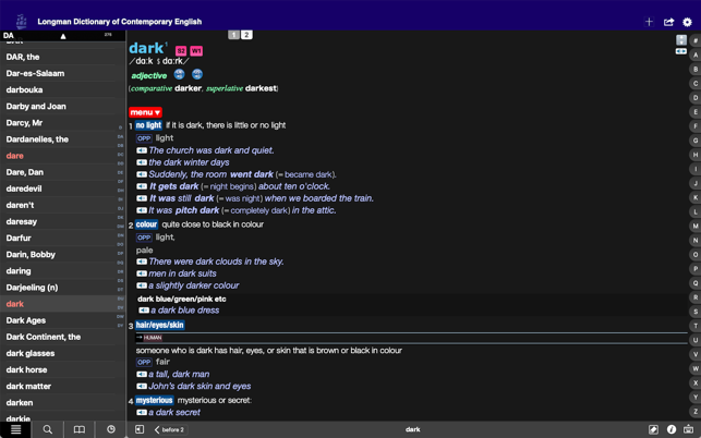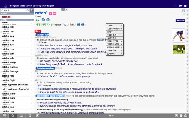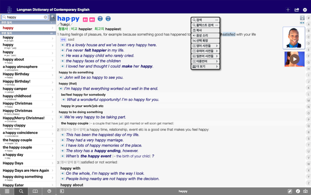 Please update to macOS Sonoma 14.4.This fixes a display bug that prevent LDOCE from displaying definitions.Longman Dictionary of Contemporary English -6th - 고급학습용 (LDOCE6) © 2015영어를 배우는 학습자가 언제 어디서든지 사용할 수 있는 최고의 사전.방대한 양의 시소러스(thesaurus) 와 콜로케이션(collocation) 정보를 수록한 학습용 영영사전의 결정판!학습용 사전은 2009년에 완전 업데이트되었으며, 이제 아이폰/아이팟용 터치 애플리케이션을 제공하고 있음. [사전의 세부사항:]● 230,000 개의 단어, 구절 및 의미 – 가장 많은 단어, 구절 보유.● Longman Corpus Network를 통해 제공되는 165,000 개의 예문들은 실제 원어민 영어를 바탕으로 영어가 실제로 어떻게 사용되는지 보여줌.● 2,000 개의 쉬운 단어들만을 사용한 명확한 정의 제공.● 영어로 말하고 쓸 때 가장 흔히 사용되는 상위 3,000 개 단어들을 마크로 표시, 꼭 알아야 할 가장 중요한 단어들을 보여줌.● Register Notes는 구어체 영어와 문어체 영어 간의 차이점을 보여줌.● 학술용어에도 식별마크를 표시, 논문작성이나 프리젠테이션 등에 손쉽게 활용할 수 있음.● 외국인이 자주 틀리는 문법과 오류에 대한 자세한 해설. ● 자주 사용되는 ‘단어들의 결합’ 사전은 80,000 개 이상의 단어들을 연결해서 영어를 유창하게 할 수 있도록 도와줌. ● 20,000 개 이상의 시소러스(thesaurus). 동의어 및 반의어, 그리고 관련어까지 함께 암기함으로써 어휘력 향상에 큰 도움을 줌.● 1,400 개의 흥미로운 단어들에 대한 단어의 역사 및 어원을 제공함. ● 모든 표제어에 대해 영국식과 미국식 발음으로 녹음한 86,000 개의 음성 파일. 눈과 귀 양쪽을 사용하여 효과적으로 단어를 암기할 수 있음.[Plus]● 86