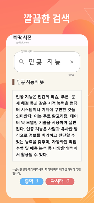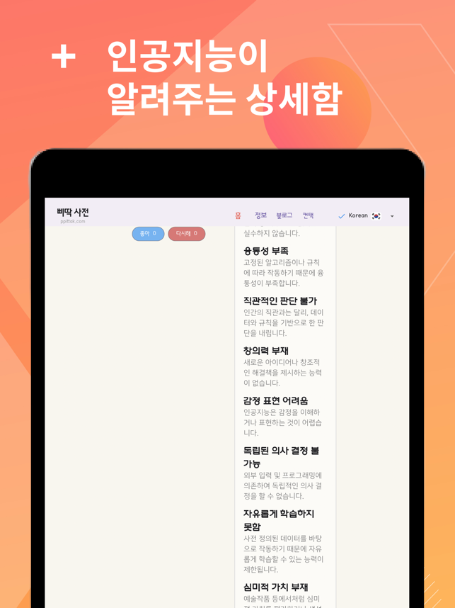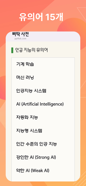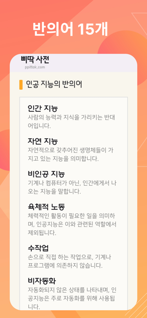좀 더 정확한 말을 하고 싶을 때문장의 다양성과 재미를 늘리고 싶을 때정반대의 생각을 해보고 싶을 때새로운 아이디어를 고민하고 있을 때삐딱 사전은 언어의 풍부함을 탐험할 수 있는 도구입니다. 이 앱은 단어의 유의어와 반의어를 쉽고 빠르게 찾아주어, 글쓰기, 공부, 혹은 단순히 언어에 대한 호기심을 충족시키는데 이상적인 선택입니다.# 주요 기능유의어 사전: 입력한 단어와 유사한 의미를 가진 단어들을 찾아줍니다.반의어 사전: 단어의 반대 의미를 가진 단어들을 손쉽게 찾을 수 있습니다.간편한 검색: 사용자 친화적인 인터페이스를 통해 빠르게 단어를 검색할 수 있습니다.#적용 분야글쓰기: 논문, 보고서, 혹은 소설 작성 시 다양한 단어를 탐색할 수 있어 문장을 더 풍부하게 만들 수 있습니다.학습: 언어 학습 시 유의어와 반의어를 통해 단어의 뉘앙스를 더 깊게 이해할 수 있습니다.데일리 사용: 일상 대화나 메시지 작성 시 적절한 단어를 빠르게 찾아 사용할 수 있습니다.아이디어 : 유의어 반의어를 통해 새로운 방향으로 생각을 넓힐 수 있습니다.심심할 때 : 비슷한 단어나 반대되는 단어를 찾는 재미도 쏠쏠합니다.진로 결정 : 다음에 뭘할지 생각해보며 반대되는 일에 도전하는 탐색을 해볼 수도 있습니다.삐딱 사전으로 단어의 세계를 더 깊게 탐험하세요. 언어의 다양성을 경험하며 언어 표현력을 한 단계 업그레이드하세요.