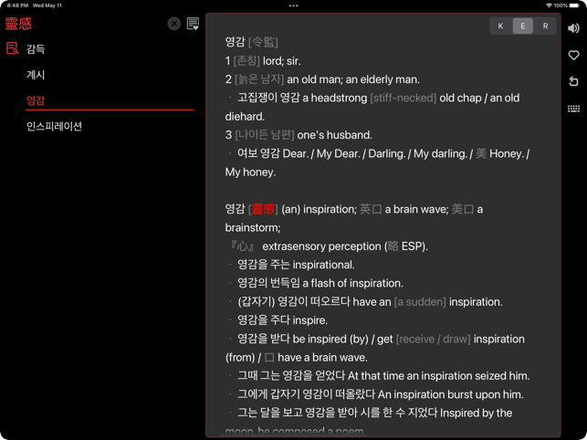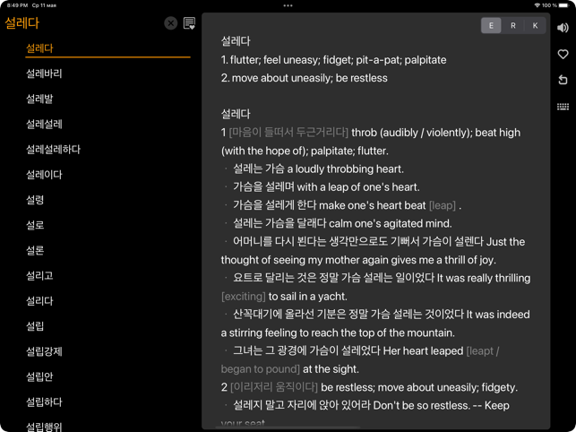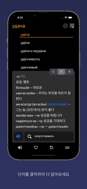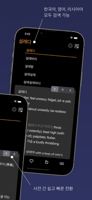 딱 필요했던 사전이네요~ 돈 주고 살 만합니다 (미미융)드디오 찾았다 여기는 말이 필요없죠. 이젠 일때문에 언어는 3가지 필해서 자꾸 사용 하게 됐어요. (iisenia)인터페이스도 깔끔해졌고. 영어까지. 일부 단어랑은 차이가 있지만 이 사전을 몇년째 쓰고 있는데 괜찮아요. 가격도 좋고요 (깨교)멀티 다국어 사전이 드디어 출시되었습니다!18개 오프라인 사전 데이터베이스를 한국어, 영어, 러시아어로 한번에 찾아보실 수 있습니다. KoRuEn Dic 고유의 유저인터페이스는 사전에 필요한 모든 기능(발음, 검색어 추천, 하이퍼링크, 북마크, 암기 카드)을 직관적이고 편리하게 사용할 수 있도록 디자인되었습니다. 주요 기능- 600,000 검색어 제공: 233,000+ 영어, 175,000+ 러시아어, 198,000+ 한국어 표제어.- 철자가 틀린 단어에 대한 제안이 포함된 통합 검색.- 각 언어에 대한 완벽한 설명이 있는 동의어 사전.- 사전 간 빠른 전환: 카드를 좌우로 스와이프하여 설명 언어를 변경할 수 있습니다.- 표제어 및 선택한 텍스트의 발음을 들을 수 있는 기능: 모든 언어의 발음을 들 수 있습니다. - 일반적으로 사용되는 각 단어의 다양한 사용 예시.- 한자 문자도 검색할 수 있습니다. - 언어 학습자를 위한 책갈피 및 플래시 카드 퀴즈.- 독특하지만 직관적이고 미니멀한 인터페이스- 하이퍼링크 콘텐츠: 단어를 탭하여 발음을 듣거나 의미를 확인할 수 있습니다.- iPhone, iPad 및 M1 Mac에서 작동합니다.- 오프라인, 광고 없는 경험.